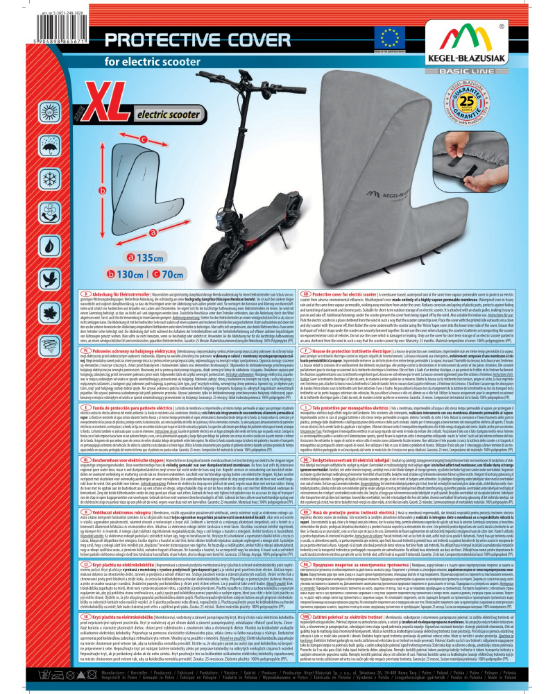 Die Abdeckung ist mit der bedruckten Seite nach außen auf einen sauberen und trockenen Roller bei ausgeschaltetem Strom aufzuziehen und dann mit den an der unteren Innenseite der Abdeckung eingenähten Klettbändern unter dem Roller zu befestigen. Man sollte sich vergewissern, dass beide Klettverschluss-Paare unter dem Roller sicher befestigt sind. Die Abdeckung darf nicht während des Aufladens der Rollerbatterie und der Rollerbeförderung auf offenen äußeren Gepäckträgern von Fahrzeugen genutzt werden. Man sollte sie nicht benutzen, wenn sie beschädigt oder undicht ist. Die Abdeckung ist nur für die gelegentliche Aufbewahrung des Elektrorollers auf überdachten Balkonen und unter Unterständen gedacht.