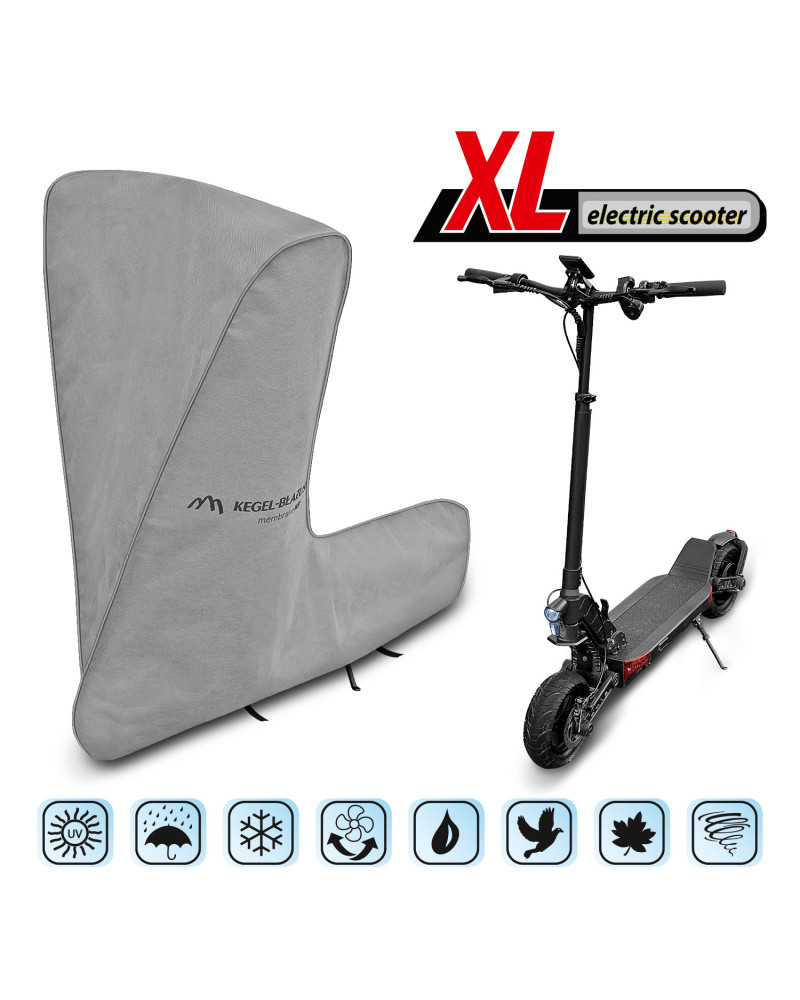 Wasserdichte und gleichzeitig dampfdurchlässige Membranabdeckung für einen Elektrotretroller zum Schutz vor ungünstigen Witterungsbedingungen. Wetterfeste Abdeckung, die vollständig aus einer hochgradig dampfdurchlässigen Membran besteht. Sie ist auch bei starkem Regen wasserdicht und zugleich dampfdurchlässig, so dass die Feuchtigkeit unter der Abdeckung nach außen geleitet wird. Sie verringert die Korrosion und Alterung von Kunststoffteilen und schützt vor Ausbleichen und Anlaufen von Lacken und Chromteilen. Sie eignet sich für die kurzfristige Aufbewahrung eines Elektrotretrollers im Freien. Sie wird mit einem Gummizug befestigt, so dass sie leicht auf- und abgezogen werden kann. Zusätzliche Verschlüsse unter dem Tretroller verhindern, dass die Abdeckung durch den Wind abgerissen wird. Sie ist auch für die Verwendung in Innenräumen geeignet.