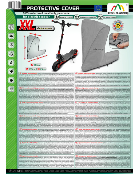 Die Abdeckung ist mit der bedruckten Seite nach außen auf einen sauberen und trockenen Roller bei ausgeschaltetem Strom aufzuziehen und dann mit den an der unteren Innenseite der Abdeckung eingenähten Klettbändern unter dem Roller zu befestigen. Man sollte sich vergewissern, dass beide Klettverschluss-Paare unter dem Roller sicher befestigt sind. Die Abdeckung darf nicht während des Aufladens der Rollerbatterie und der Rollerbeförderung auf offenen äußeren Gepäckträgern von Fahrzeugen genutzt werden. Man sollte sie nicht benutzen, wenn sie beschädigt oder undicht ist. Die Abdeckung ist nur für die gelegentliche Aufbewahrung des Elektrorollers auf überdachten Balkonen und unter Unterständen gedacht.