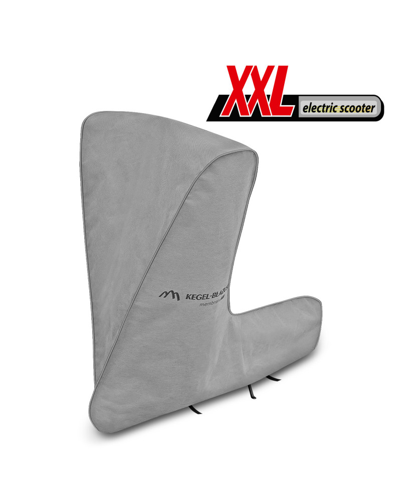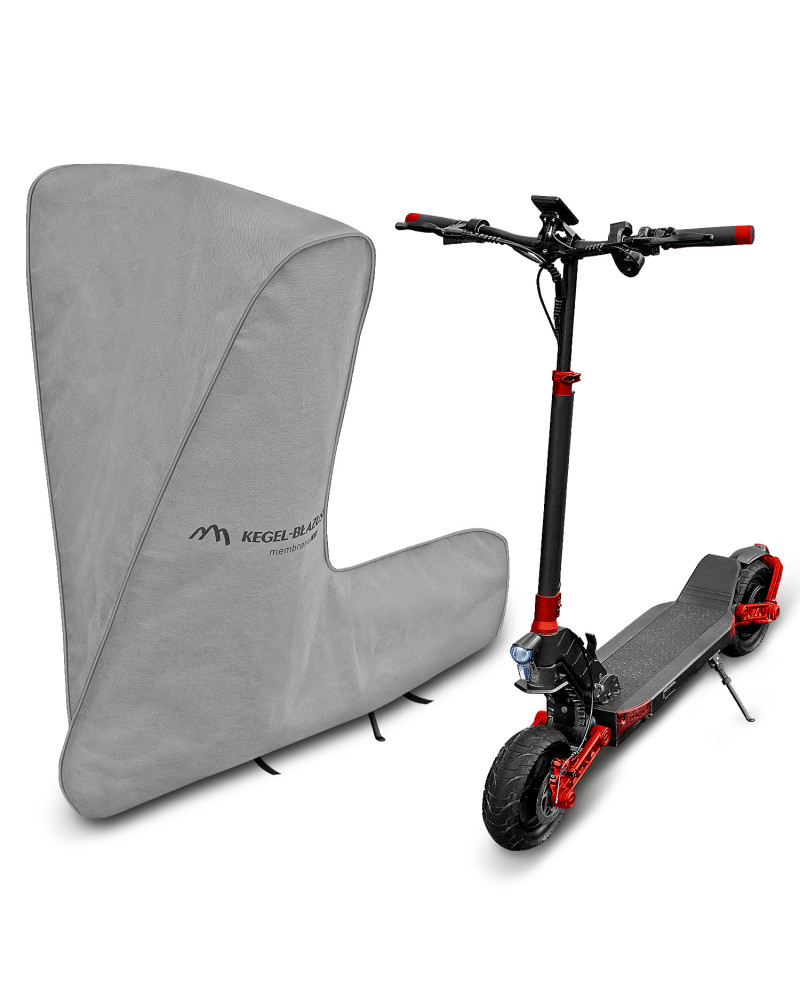 Wasserdichte und gleichzeitig dampfdurchlässige Membranabdeckung für einen Elektrotretroller zum Schutz vor ungünstigen Witterungsbedingungen. Wetterfeste Abdeckung, die vollständig aus einer hochgradig dampfdurchlässigen Membran besteht. Sie ist auch bei starkem Regen wasserdicht und zugleich dampfdurchlässig, so dass die Feuchtigkeit unter der Abdeckung nach außen geleitet wird. Sie verringert die Korrosion und Alterung von Kunststoffteilen und schützt vor Ausbleichen und Anlaufen von Lacken und Chromteilen. Sie eignet sich für die kurzfristige Aufbewahrung eines Elektrotretrollers im Freien. Sie wird mit einem Gummizug befestigt, so dass sie leicht auf- und abgezogen werden kann. Zusätzliche Verschlüsse unter dem Tretroller verhindern, dass die Abdeckung durch den Wind abgerissen wird. Sie ist auch für die Verwendung in Innenräumen geeignet.