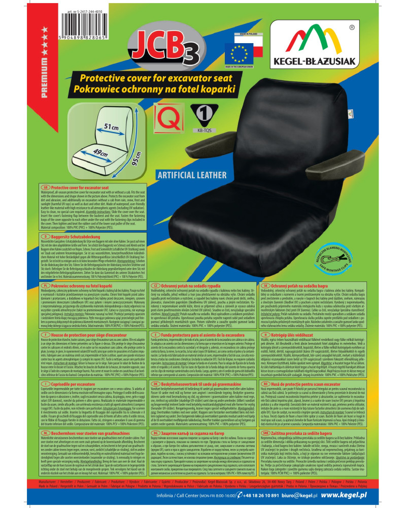 Wasserdichte Ganzjahres-Schutzabdeckung für Sitze von Baggern mit oder ohne Kabine. Sie passt auf einen Sitz mit der oben abgebildeten Größe und Form. Sie schützt den Baggersitz vor Schmutz und Abrieb und bei Baggern ohne Kabine zusätzlich vor Regen, Schnee, Frost und Sonnenlicht (schädlicher UV-Strahlung) sowie vor Staub und anderem Verunreinigungen. Sie ist aus wasserdichtem, benutzerfreundlichem lederähnlichem Material mit hoher Beständigkeit gegen alle Witterungseinflüsse (einschließlich UV-Strahlung) hergestellt. Sie ist leicht zu reinigen und es ist keine besondere Pflege erforderlich.