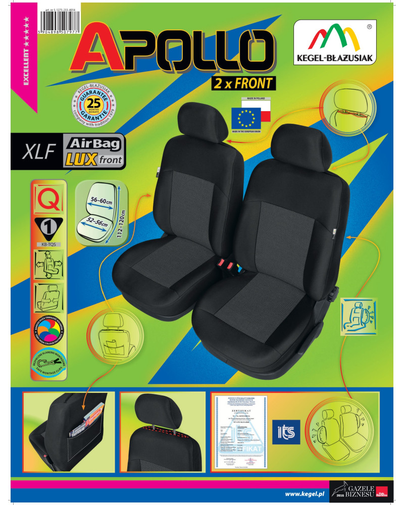 Die APOLLO-Bezüge sind sehr haltbar und praktisch, aber auch geschmackvoll und elegant. Das Produkt richtet sich an diejenigen, die den Innenraum ihres Fahrzeugs verschönern und die Polsterung vor Schmutz, Abrieb und Beschädigung schützen wollen. Die Bezüge können bedenkenlos bei 40° gewaschen werden, wie auf dem Etikett empfohlen.