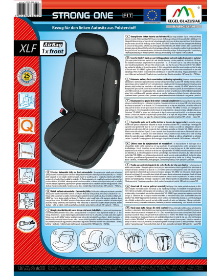 Die Montageanleitung des Bezugs wird auf den Abbildungen 1 bis 5 dargestellt Wenn der Bezug auf einem Sitz mit Seitenairbag angebracht ist, muss der Bezug so auf dem linken Sitz des Fahrzeugs platziert werden, dass die Naht des Bezugs mit dem Einnäher „SRS-AIRBAG“ die linke Kante des Sitzes überlappt (siehe Abbildung 2). Lässt sich der Bezug nicht so aufziehen, dass der Bezugrand mit dem Einnäher „SRS-AIRBAG” nicht den linken Sessellehnenrand überlappt, so kann der Bezug nicht mit Sesseln mit Seitenairbag genutzt werden. Ein verbrauchter, modifizierter oder instandgesetzter Bezug darf nicht mit Sesseln verwendet werden, die über einen Seitenairbag verfügen.