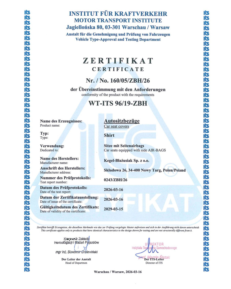 Die Betriebssicherheit unserer Bezüge belegen ein Zertifikat und die Prüfberichte des Instytut Transportu Samochodowego (poln. Instituts für Kraftverkehr)
