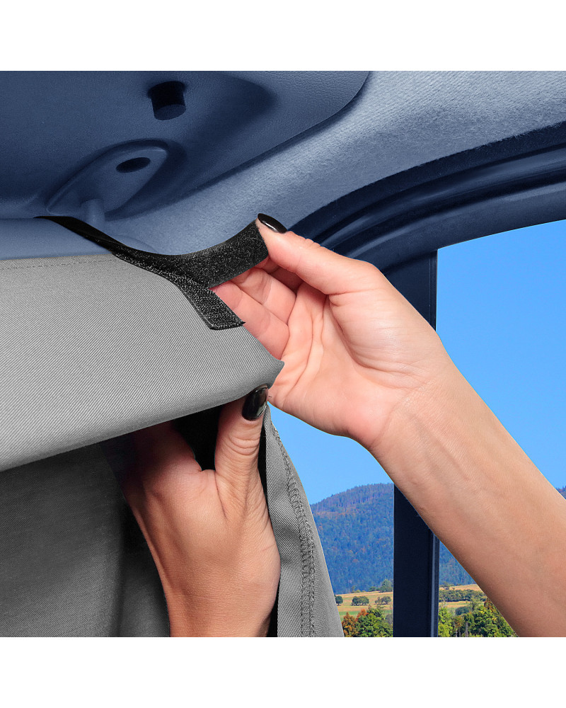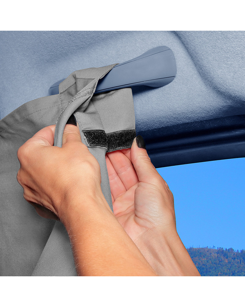 Vorhang für die Front- und die Seitenscheiben zum Abschirmen des Fahrerhauses von Wohnmobilen und Lieferwagen. Er eignet sich sehr gut dazu, das Fahrerhaus vor neugierigen Blicken Fremder draußen zu schützen. Er sorgt für ein Gefühl der Privatsphäre auch auf einem überfüllten Campingplatz bzw. Parkplatz. Er verringert den Temperaturanstieg im Inneren des Fahrzeugs. Er lässt sich leicht anbringen und abnehmen und muss weder festgeschraubt noch angeklebt werden. Dank dem in die Unterkante eingenähten Gewicht wird der Vorhang beim Ein- und Aussteigen in Position gehalten.