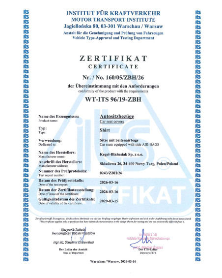 Die Betriebssicherheit unserer Bezüge belegen ein Zertifikat und die Prüfberichte des Instytut Transportu Samochodowego (poln. Instituts für Kraftverkehr)