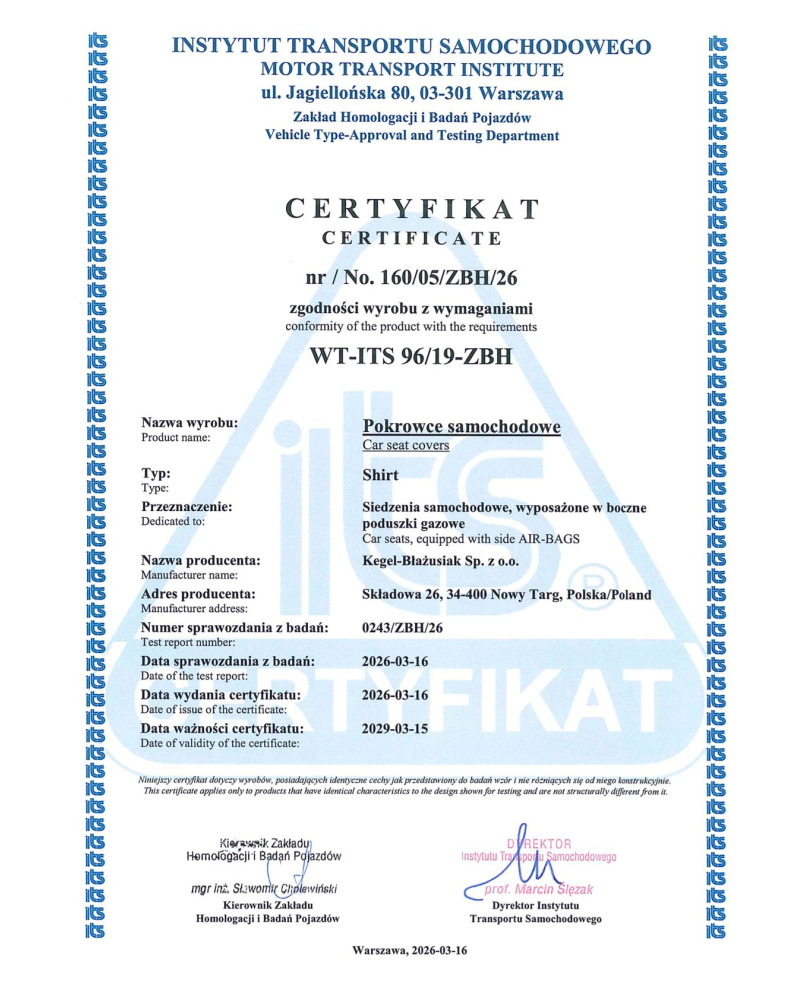 Die Betriebssicherheit unserer Bezüge belegen ein Zertifikat und die Prüfberichte des Instytut Transportu Samochodowego (poln. Instituts für Kraftverkehr)