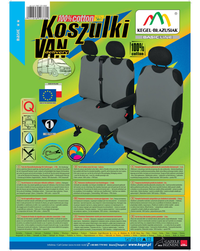 Die COTTON DV (Delivery Van)-Bezüge sind universelle Bezüge für Lieferwagen, die aus 100% Baumwolle, einem hochwertigen, natürlichen Material, hergestellt werden. Dank ihrer Struktur haften die Bezüge gut auf den Sitzen, und die PUR-Schaumeinlage auf der Materialinnenseite verhindert ein Verrutschen.