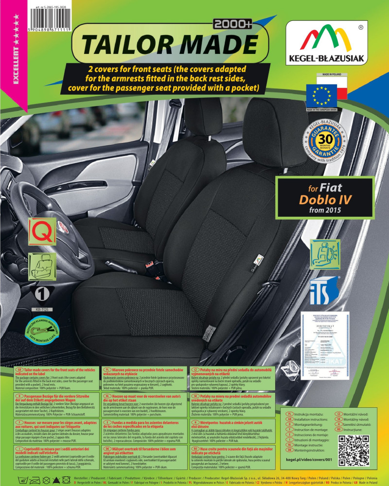 2 Bezuge für vordere Sitze (Bezüge angepasst an die Armstützen in den seitlichen Lehnenteilen, Bezug für den Beifahrersitz ausgestattet mit einer Tasche)