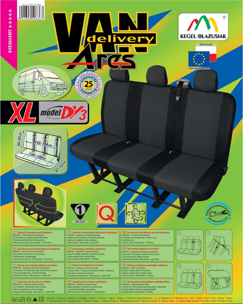 Die ARES-Bezüge sind sehr haltbar und praktisch, aber auch geschmackvoll und elegant. Das Produkt richtet sich an diejenigen, die den Innenraum ihres Fahrzeugs verschönern und die Polsterung vor Schmutz, Abrieb und Beschädigung schützen wollen. Die Bezüge können bedenkenlos bei 40° gewaschen werden, wie auf dem Etikett empfohlen.