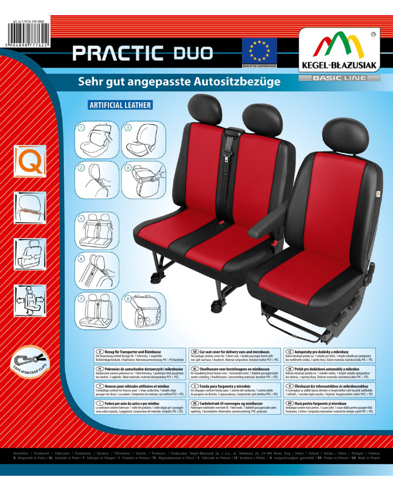PRACTIC DUO-Bezüge sind aus extrem haltbarem Ökoleder der neuen Generation gefertigt. Jeder Bezug besteht aus einem robusten und langlebigen Material, das sich dank seiner geeigneten Konstruktion gut an den Sitz anpasst und an ihm haftet, so dass der Bezug nicht verrutschen kann. Die solide Verarbeitung garantiert eine hohe Qualität und eine lange Nutzungsdauer.