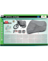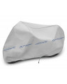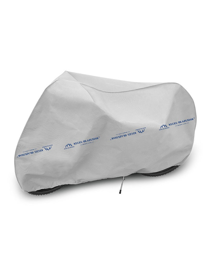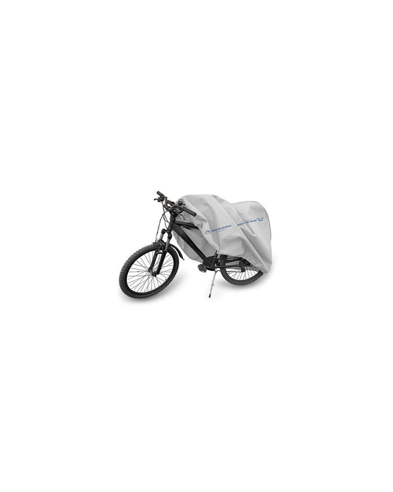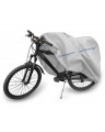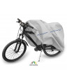 Wasserdichte und gleichzeitig dampfdurchlässige Membranabdeckung für ein im Freien abgestelltes Fahrrad zum Schutz vor ungünstigen Witterungsbedingungen. Es handelt sich hierbei um eine wetterfeste Abdeckung, die vollständig aus einer hochgradig dampfdurchlässigen Membran hergestellt ist. Sie ist auch bei starkem Regen wasserdicht und zugleich dampfdurchlässig, so dass die Feuchtigkeit unter der Abdeckung abtransportiert wird. Sie verringert die Korrosion und Alterung von Kunststoffteilen und schützt vor Ausbleichen und Anlaufen von Lacken und Chromteilen. Sie wird mit einem Gummizug befestigt, so dass sie leicht auf- und abgezogen werden kann. Ein zusätzlicher Verschluss unter dem Fahrrad verhindert, dass die Abdeckung durch den Wind abgerissen wird. Sie eignet sich für die lang- oder kurzfristige Aufbewahrung eines Fahrrads ohne Elektromotor im Freien. Sie ist auch für die Verwendung in Innenräumen geeignet.