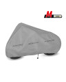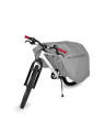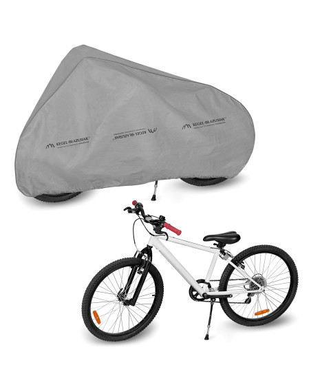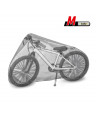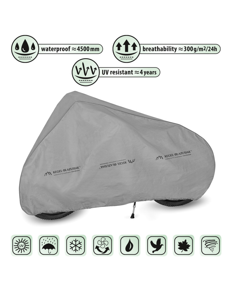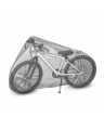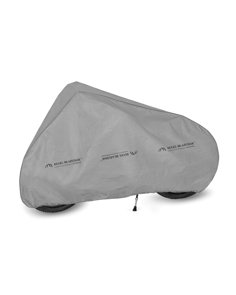 Wasserdichte und gleichzeitig dampfdurchlässige Membranabdeckung für ein im Freien abgestelltes Fahrrad zum Schutz vor ungünstigen Witterungsbedingungen. Es handelt sich hierbei um eine wetterfeste Abdeckung, die vollständig aus einer hochgradig dampfdurchlässigen Membran hergestellt ist. Sie ist auch bei starkem Regen wasserdicht und zugleich dampfdurchlässig, so dass die Feuchtigkeit unter der Abdeckung abtransportiert wird. Sie verringert die Korrosion und Alterung von Kunststoffteilen und schützt vor Ausbleichen und Anlaufen von Lacken und Chromteilen. Sie wird mit einem Gummizug befestigt, so dass sie leicht auf- und abgezogen werden kann. Ein zusätzlicher Verschluss unter dem Fahrrad verhindert, dass die Abdeckung durch den Wind abgerissen wird. Sie eignet sich für die lang- oder kurzfristige Aufbewahrung eines Fahrrads ohne Elektromotor im Freien. Sie ist auch für die Verwendung in Innenräumen geeignet.