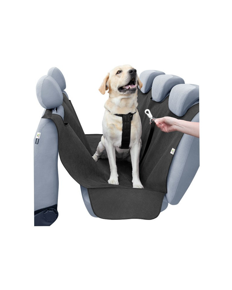 ALEX Der Schonbezug für die Beförderung eines Hundes auf der Rücksitzbank, mit Öffnungen, die es ermöglichen, den Hund mit Auto-Hundeleine an den Sicherheitsgurten zu befestigen. Der Schonbezug, gehangen in Form der Hängematte", verhindert, dass sich der Hund bei Vollbremsung verletzt. Er schützt die Rücksitzbank (auch die Seitenteile) wirksam vor Verschmutzungen und Beschädigungen. Nicht beschmutzend, leicht zu reinigen, er nimmt keine Gerüche auf und saugt keine Flüssigkeit auf. Antiallergisch und körperfreundlich für den Hund und Menschen. Durch integrierte die es möglich machen, den Schonbezug an den vorderen und hinteren Kopfstützen, aufzuhängen" ist der Schonbezug sehr leicht und mit Beschmutzungen (Pfotenschmutz, Hundehaare usw.) abzunehmen. Fest, widerstandsfähig und wasserdicht, geeignet für die Beförderung von großen Hunden in jedem Personenkraftwagen, ausgestattet mit verstellbaren vorderen und hinteren Kopfstützen. Er kann auch zum Transport des Gepäcks Metallstreben, zusammenzulegen und kleinen und nach "Aufhängen" nur an hinteren Kopfstützen zum Transport des Hundes mit dem Beifahrer und als Kofferraummatte dienen.