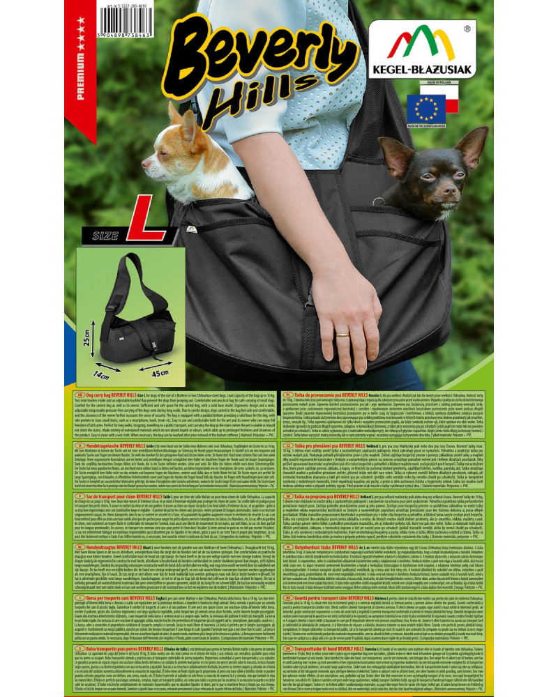 Größe L für einen Hund von der Größe eines Maltesers oder zwei Chihuahuas. Tragfähigkeit der Tasche bis zu 10 kg. Mit zwei Minileinen im Inneren der Tasche und mit einer verstellbaren Reißverschlussklappe zur Sicherung der Hunde gegen Herausspringen.