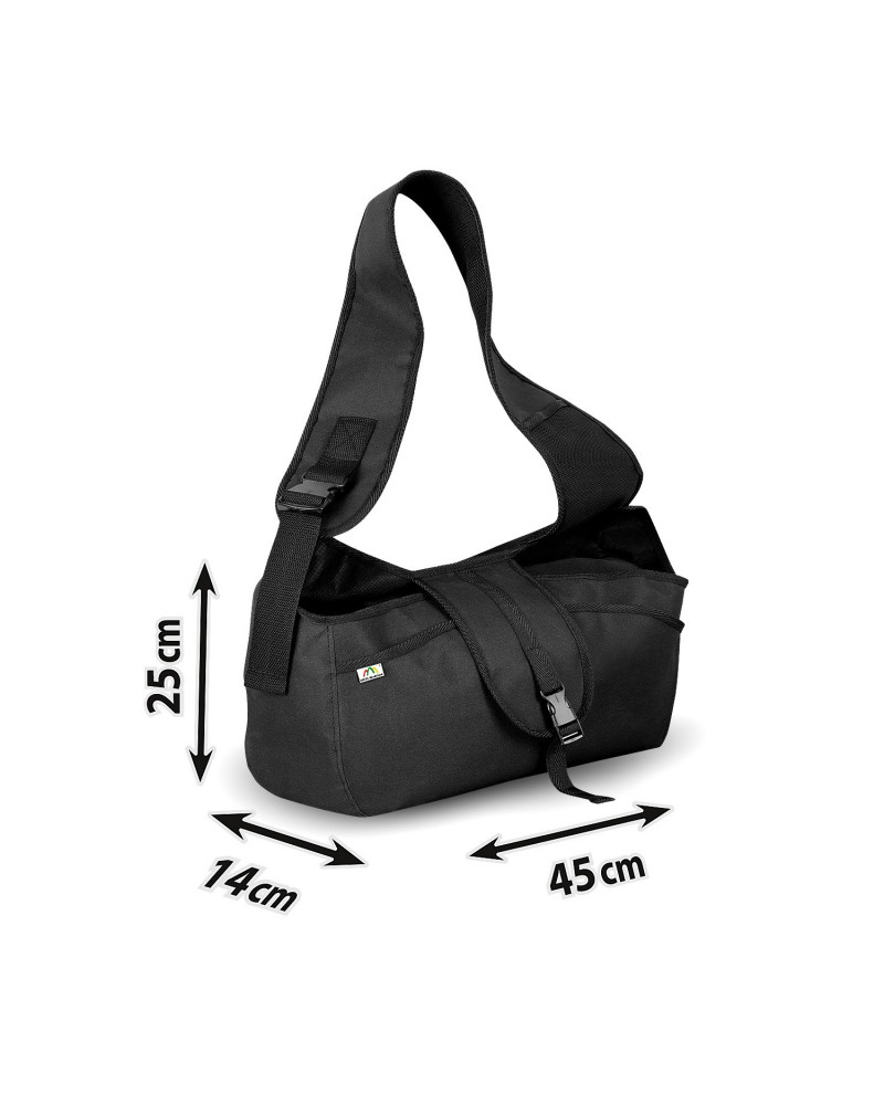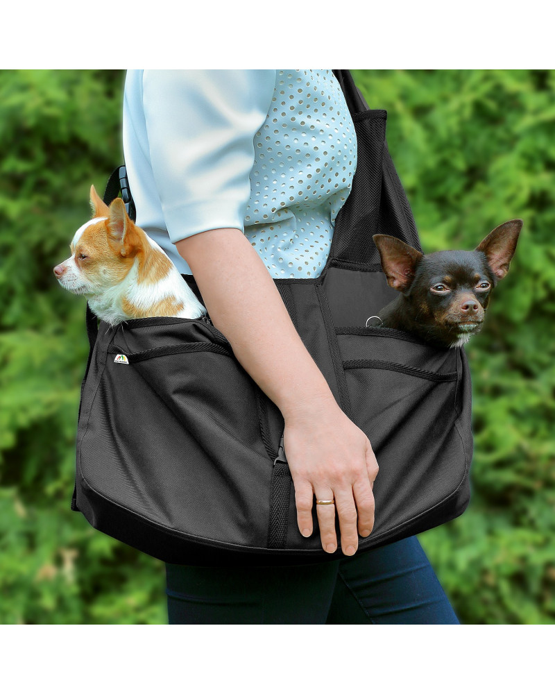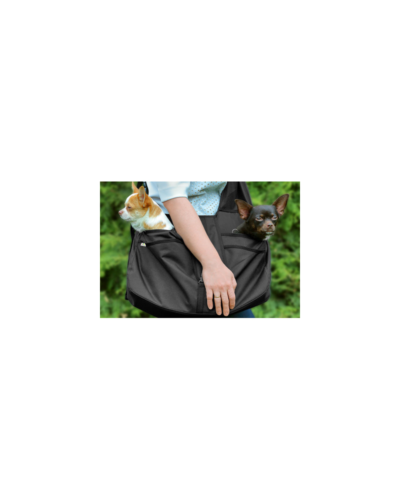 Es handelt sich um eine bequeme und praktische Tasche zum Tragen von kleinen Hunden. Sie stellt den Komfort für den getragenen Hund und dessen Halter sicher. Sie bietet dem Hund einen sicheren Platz und eine solide Unterlage. Deren ergonomische Konstruktion und ein breiter und verstellbarer Armgurt ermöglichen dem Halter ein druckfreies Tragen des Hundes/der Hunde auch bei langen Spaziergängen. Dank des sorgfältig durchdachten Designs fühlen sich Hunde, die in der Tasche befördert werden, sicher und wohl. Die Nähe des Halters erhöht noch deren Sicherheitsgefühl. Die Tasche hat einen gepolsterten Boden, um den Hund einen soliden Stand zu bieten und Taschen, um kleine Gegenstände wie ein Smartphone, die Leine, Leckerlis, etc. zu verstauen. Die Tasche ermöglicht dem Halter nicht nur das einfache und bequeme Tragen des Haustieres, sondern sorgt dafür, dass er beide Hände frei hat.