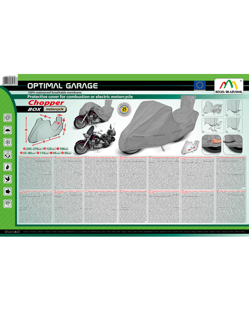 Stellen Sie das Motorrad an einem windgeschützten Ort so ab, dass es nicht umkippen kann. Die Abdeckung ist mit der bedruckten Seite nach außen auf ein sauberes und trockenes Motorrad nach Abkühlen des Auspuffrohrs und aller Motorenkomponenten (bei einem Verbrennungsmotorrad) oder nach Abschalten der Energieversorgung (bei einem Elektromotorrad) aufzuziehen. Die Abzieherseile kreuzen und fest zusammenziehen und dabei die Kräfte parallel zum Motorradheck richten (siehe Abbildung Nr. 2). Die Abzieherseile sind zuzubinden und es ist zu prüfen, ob sich der Knoten nach dem Ziehen des Abziehers nicht löst. Löst sich der Knoten, so ist der Vorgang zu wiederholen und die Bindemethode zu ändern. Danach ist die Abdeckung unter dem Motorrad mit, an der unteren Innenseite der Abdeckung angenähten, Klettverschlüssen zu befestigen. Man sollte sich vergewissern, dass beide Klettverschluss-Paare unter dem Motorrad sicher befestigt sind. Die Abdeckung darf nicht während des Aufladens der Motorradbatterie und der Motorradbeförderung auf offenen äußeren Gepäckträgern von Fahrzeugen genutzt werden. Man sollte sie nicht benutzen, wenn sie beschädigt, von innen verschmutzt oder undicht ist.