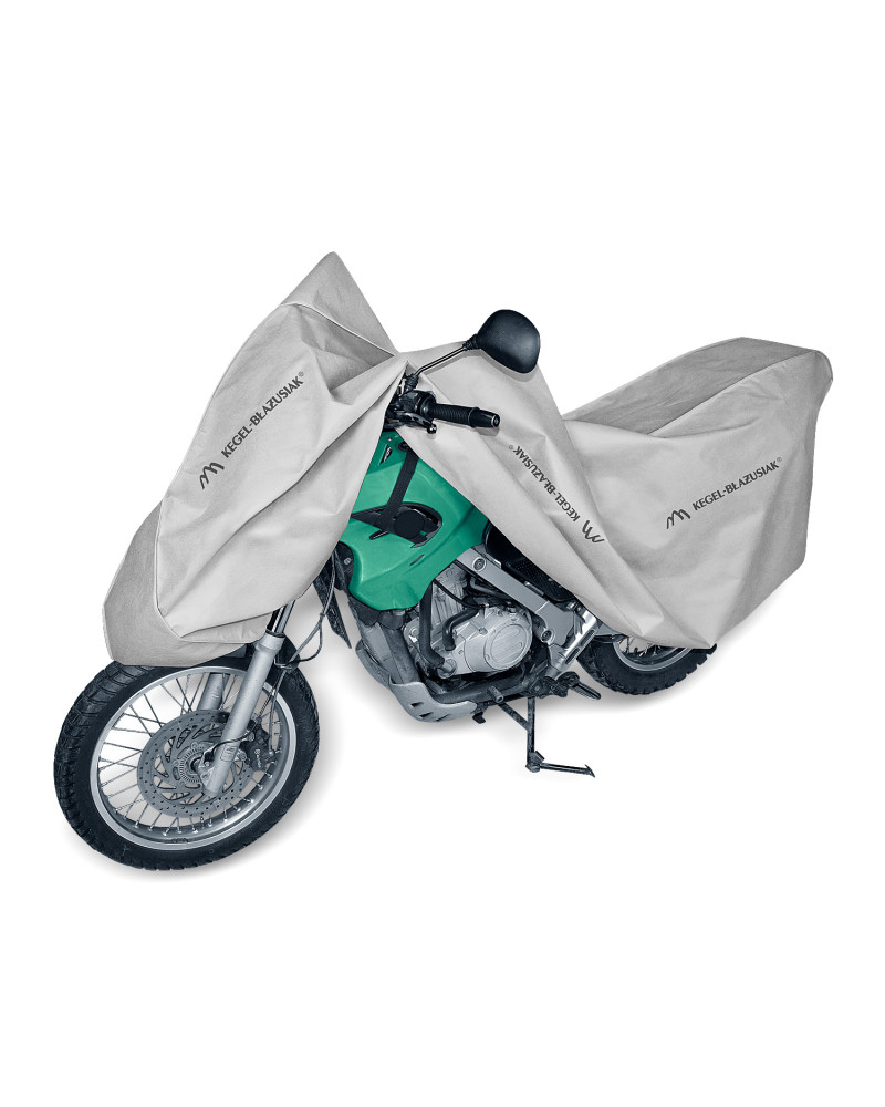 Wasserdichte und gleichzeitig dampfdurchlässige Membranabdeckung für ein Verbrennungs- oder Elektromotorrad zum Schutz vor ungünstigen Witterungsbedingungen. Es handelt sich hierbei um eine wetterfeste Abdeckung, die vollständig aus einer hochgradig dampfdurchlässigen Membran hergestellt ist. Sie ist auch bei starkem Regen wasserdicht und zugleich dampfdurchlässig, so dass die Feuchtigkeit unter der Abdeckung abtransportiert wird. Sie schützt vor Regen, Schnee, Frost und Sonnenlicht (schädlicher UV-Strahlung) sowie Verunreinigungen wie Staub, Vogelkot und Baumsäfte. Sie verringert die Korrosion und Alterung von Kunststoffteilen und schützt vor Ausbleichen und Anlaufen von Lacken und Chromteilen. Sie eignet sich für die lang- oder kurzfristige Aufbewahrung von Verbrennungsmotorrädern bzw. die kurzfristige Aufbewahrung von Elektromotorrädern im Freien. Sie ist auch für die Verwendung in Innenräumen geeignet. Ein Kordelzug mit Seil und zusätzliche Befestigungen unter dem Motorrad schützen die Abdeckung vor dem Abreißen durch den Wind. In der Abdeckung sind Ösen angebracht, die das Anbinden der Abdeckung am Motorrad-Vorderrad mittels Verschluss oder Kette ermöglichen.