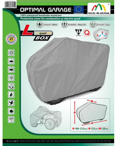 Wasserdichter Schonbezug für das Quad, der die Feuchtigkeit unter dem Schonbezug abführt. Er schützt das Quad ganzjährig vor schädlichen Umwelteinflussen. Er ist leicht aufzubringen und abzunehmen. Dank einer speziellen Struktur und Anfertigung aus wasserdichter dampfdurchlässiger Membran und schwer wasserdurchlässigem dampfdurchlässigem Material ist der Schonbezug im Regen fast vollständig dicht, und führt zugleich bei positiver Umgebungstemperatur die unter dem Schonbezug angesammelte Feuchtigkeit nach außen ab. Der Schonbezug schützt vor Rostflecken, Ausbleichen und Mattwerden des Lacks und der Chromteile. Er schützt vor den meisten Kratzern. Dank Einsatz eines Schonbezuges bleibt die Korrosion beschränkt. Der Schonbezug schützt vor Regen (darunter auch saurerem), Sonnenstrahlung (UV), Staub, Vogelkot, Blättern und Baumsaft, Schnee und Raureif. Der Schonbezug zeichnet sich durch eine gute Passform aus. Er wird mit Hilfe eines traditionellen Tunnelzuges mit Kordel über dem ganzen Quad festgespannt, ist aus festem glattem Material (vom Inneren) angefertigt, so dass er sogar bei starkem Wind sicher eingesetzt werden kann. 2 Jahre Garantie.