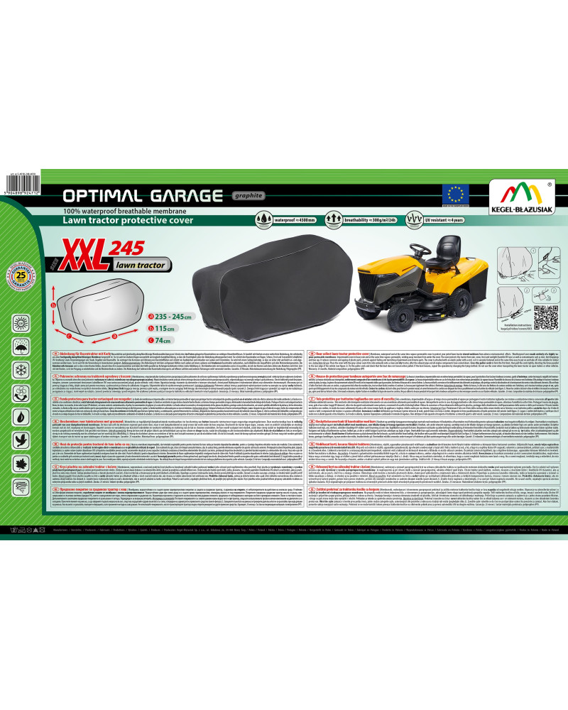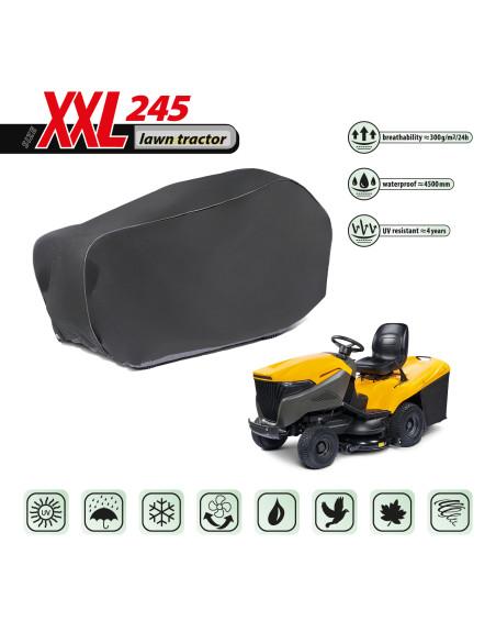 Ganzjahresabdeckung zum Schutz eines im Freien gelagerten Rasentraktors vor widrigen Umwelteinflüssen. Dank ihrer speziellen Konstruktion läuft das Wasser bei Regen von der Abdeckung ab, ohne unter die Abdeckung zu dringen, und der Wasserdampf wird nach außen abgeleitet. Sie schützt den Rasentraktor vor Regen, Schnee, Frost und Sonnenlicht (schädlicher UV-Strahlung) sowie Verunreinigungen wie Staub, Vogelkot und Baumsäfte. Sie verringert die Korrosion und Alterung von Kunststoffteilen und schützt vor Ausbleichen und Anlaufen von Lacken und Chromteilen. Die Abdeckung hält allen Witterungsbedingungen stand.