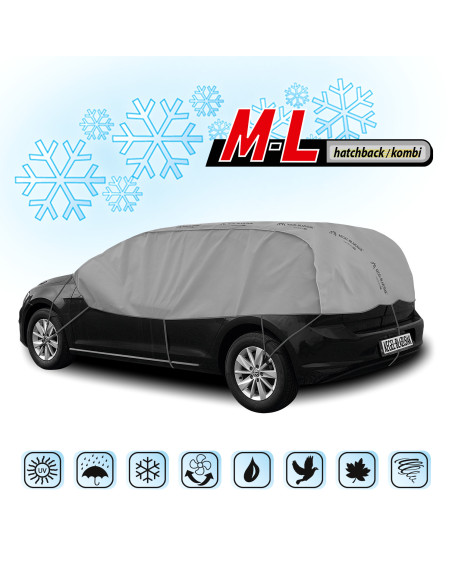 Schutzhülle für den Ganzjahresgebrauch. Im Winter schützt die Schutzhülle die Scheiben und Spiegel eines draußen geparkten Wagens vor Frost und Schnee. Sie deckt die Klinken und Wagenschlösser ab und schützt diese vor dem Gefrieren. Außerdem schützt die Schutzhülle die Scheiben und das Wagendach das ganze Jahr über vor Baumsäften, Vogelexkrementen und Staubablagerungen. Die Schutzhülle ist schwer wasserdurchlässig und schwer dampfdurchlässig.