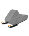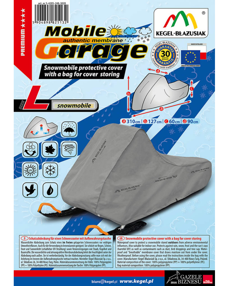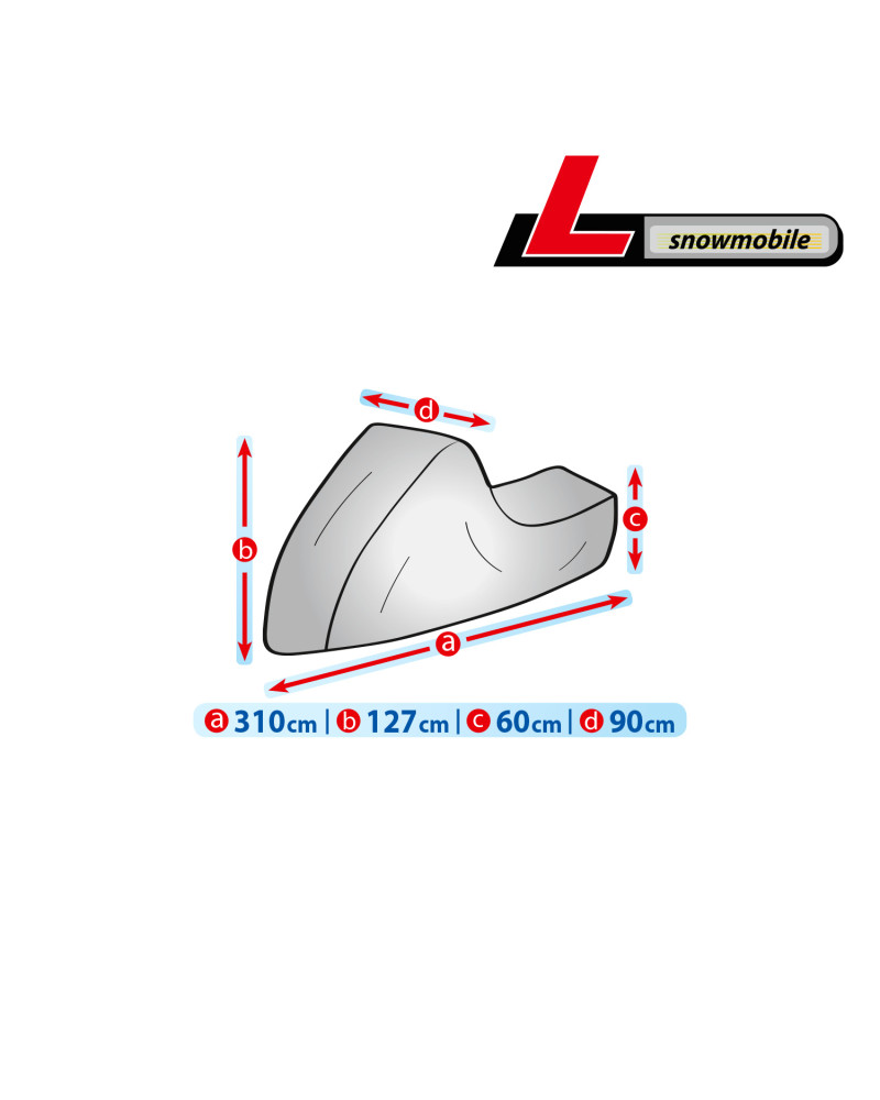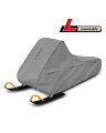 Wasserdichte Abdeckung zum Schutz eines im Freien gelagerten Schneescooters vor widrigen Umwelteinflüssen. Auch für die Verwendung in Innenräumen geeignet. Sie schützt vor Regen, Schnee, Frost und Sonnenlicht (schädlicher UV-Strahlung) sowie Verunreinigungen wie Staub, Vogelkot und Baumsäfte. Die wasserdichte und atmungsaktive Membranabdeckung leitet die Feuchtigkeit unter der Abdeckung nach außen. Sie ist wetterbeständig. Vor der Abdeckungsnutzung sollte man sich mit der Anleitung im Inneren der Aufbewahrungstasche vertraut machen.