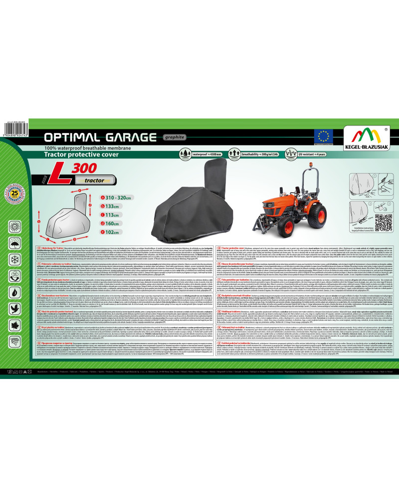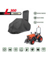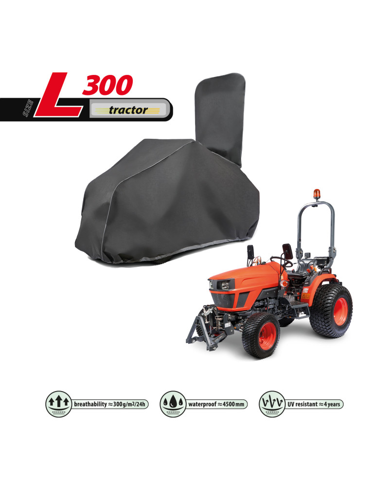 Wasserdichte und gleichzeitig dampfdurchlässige Membranabdeckung zum Schutz eines im Freien gelagerten Traktors vor widrigen Umwelteinflüssen. Es handelt sich hierbei um eine wetterfeste Abdeckung, die vollständig aus einer hochgradig dampfdurchlässigen Membran hergestellt ist. Sie ist auch bei starkem Regen wasserdicht und zugleich dampfdurchlässig, so dass die Feuchtigkeit unter der Abdeckung abtransportiert wird. Sie schützt den Traktor vor Regen, Schnee, Frost und Sonnenlicht (schädlicher UV-Strahlung) sowie Verunreinigungen wie Staub, Vogelkot und Baumsäfte. Sie verringert die Korrosion und Alterung von Kunststoffteilen und schützt vor Ausbleichen und Anlaufen von Lacken und Chromteilen.
