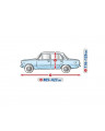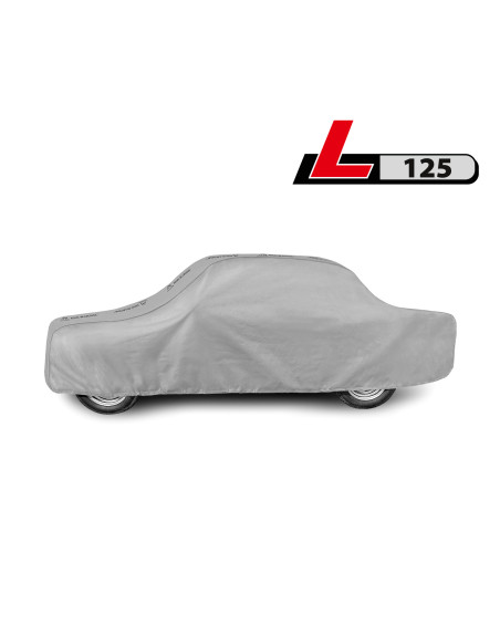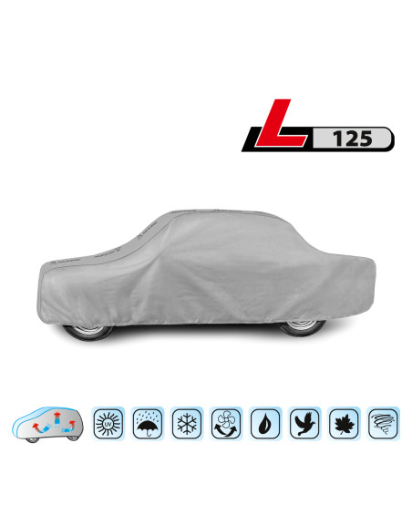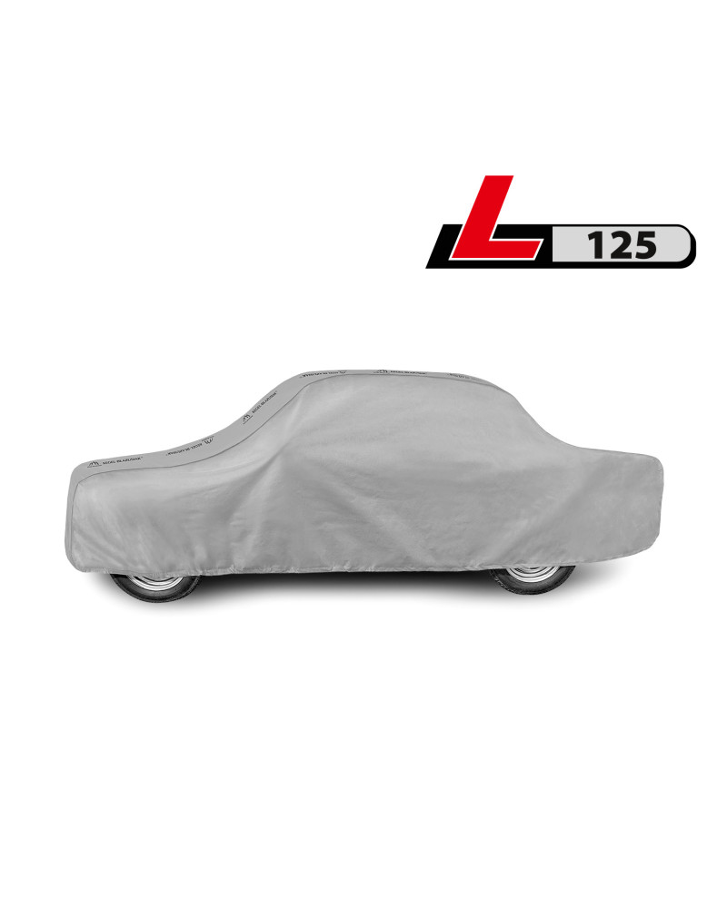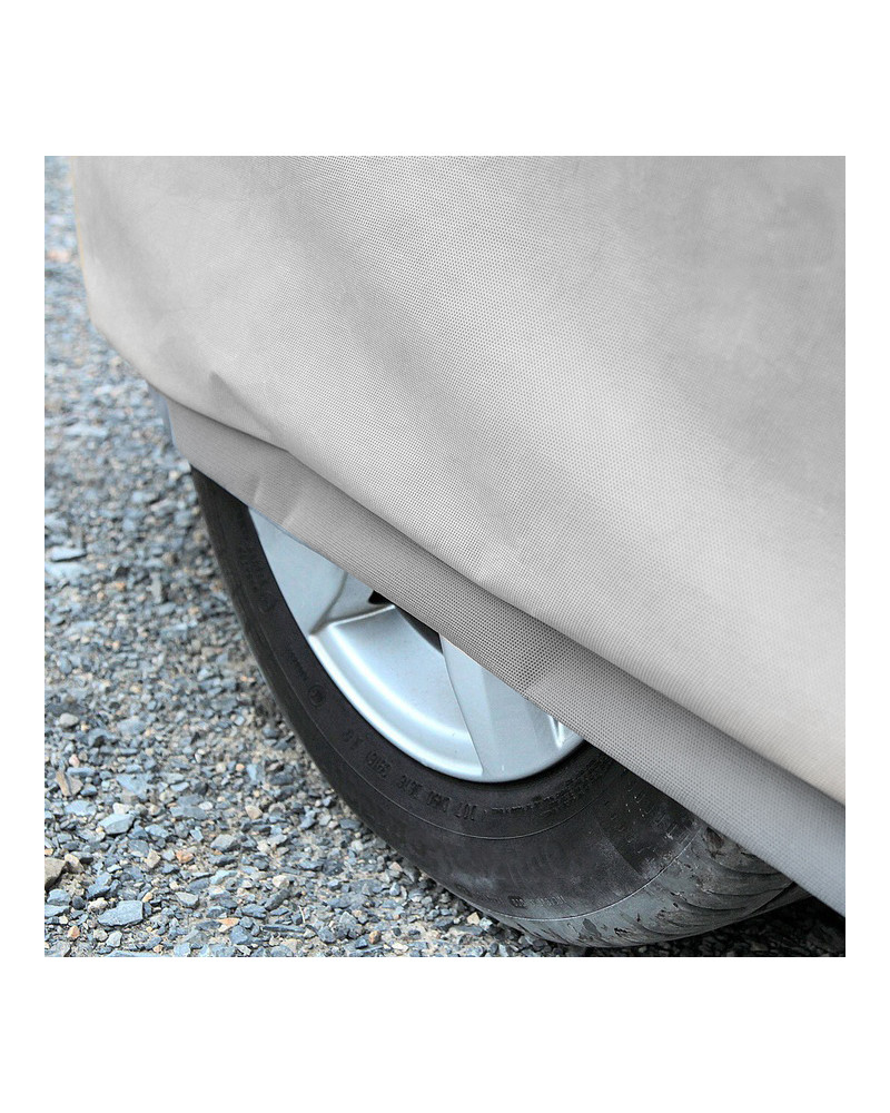 Ganzjährige, wasserdichte Autoschutzabdeckung BASIC GARAGE, die die sich unter der Abdeckung ansammelnde Feuchte nach außen leitet. Sie ist für den ganzjährigen Schutz eines geparkten Wagens vor ungünstigen Witterungsbedingungen konzipiert. Dank der Verwendung von zwei Stoffarten bleibt die Abdeckung auch bei intensiven Regenschauern fast komplett dicht und leitet die sich unter der Abdeckung sammelnde Feuchte nach außen ab. Der obere Abdeckungsteil ist aus einem einschichtigen wasserdichten Material gefertigt. Die Seitenflanken sind aus einem schwer dampfdurchlässigen Material gefertigt.