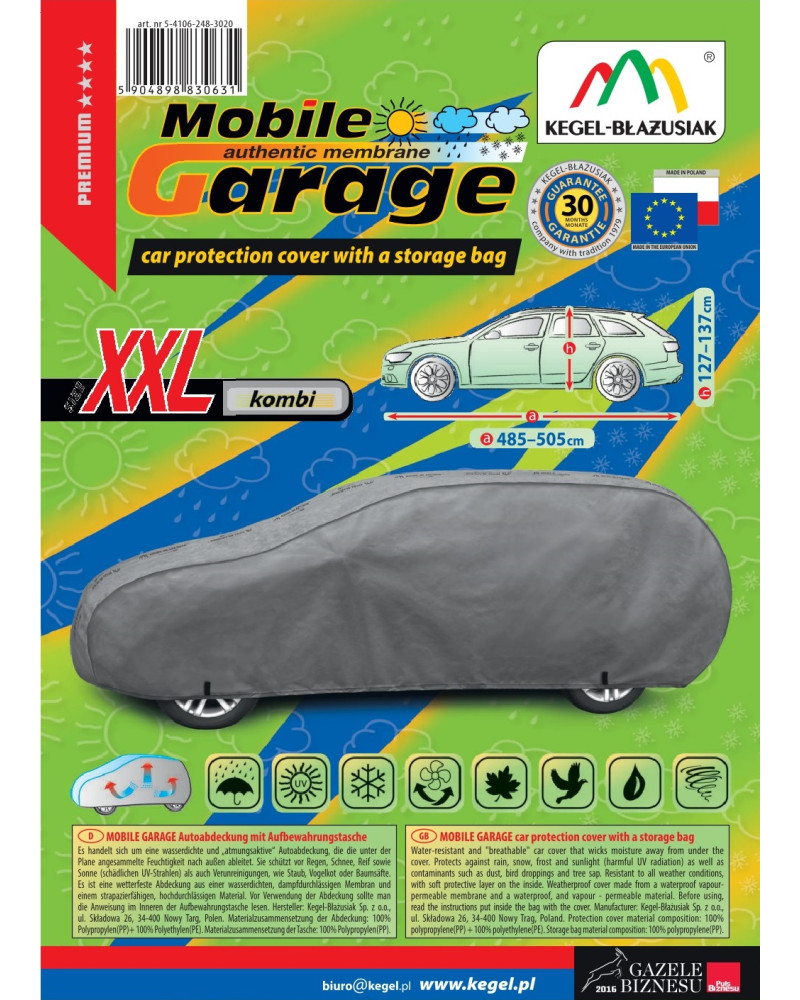Wasserdichter Schonbezug für das ganze Kraftfahrzeug, der die Feuchtigkeit unter dem Schonbezug abführt. Er schützt das Kraftfahrzeug ganzjährig vor schädlichen Umwelteinflüssen. Der Schonbezug ist für die Fahrzeugmodelle geeignet, die in der oben genannten Tabelle aufgeführt wurden. Er ist leicht aufzubringen und abzunehmen. Dank einer speziellen Struktur und Anfertigung aus dreischichtiger wasserdichter dampfdurchlässiger Membran und schwer wasserdurchlässigem dampfdurchlässigem Material ist der Schonbezug im Regen fast vollständig dicht, und führt zugleich bei positiver Umgebungstemperatur die unter dem Schonbezug angesammelte Feuchtigkeit nach außen ab.