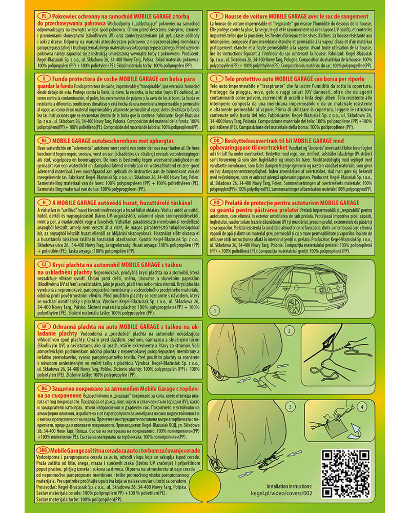 Die Abdeckung ist auf ein reines Fahrzeug mit der Aufdruckseite nach außen aufzuziehen. Danach hat man die Bundleine fest zusammenzuziehen und sie zuzubinden. Eine von innen verschmutzte Hülle darf nicht verwendet werden. Die Abdeckung ist nur für die Nutzung mit einem geparkten Wagen bestimmt. Sie darf nicht beim Transport des Fahrzeugs auf einem Autotransportanhänger verwendet werden.