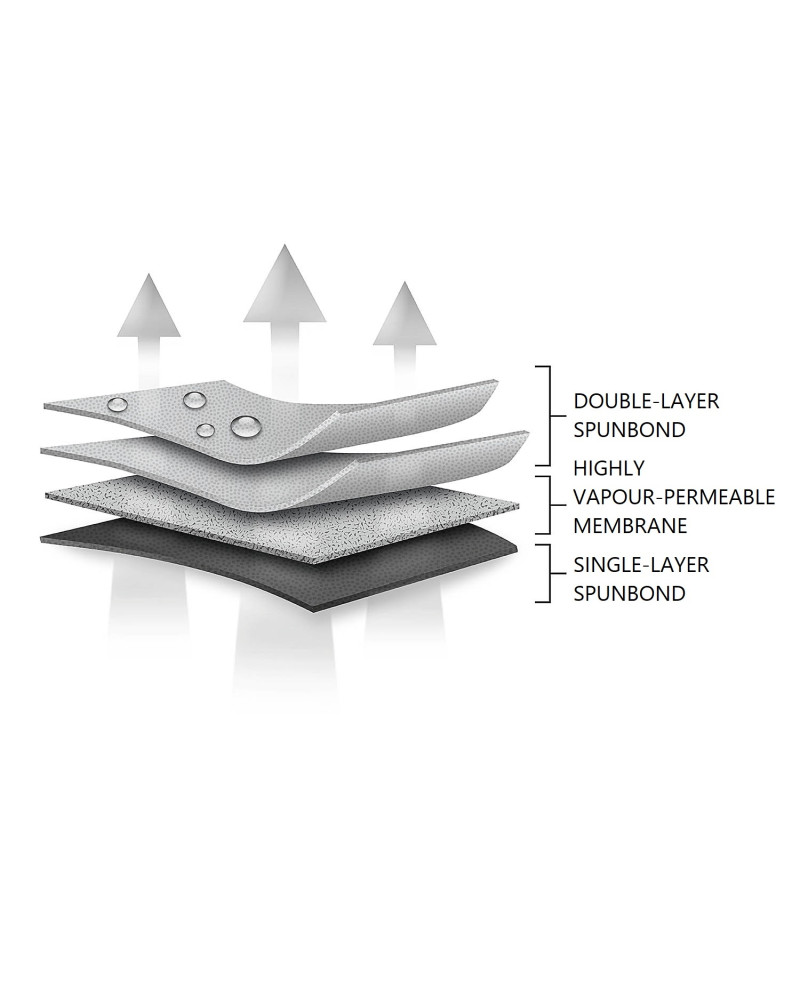 Die Seiten der Abdeckung bestehen dagegen aus 2-lagigem SPUNBOND-Vlies. Die Seiten der Abdeckung sind hochgradig dampfdurchlässig und sehr wasserabweisend.