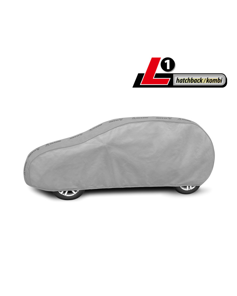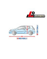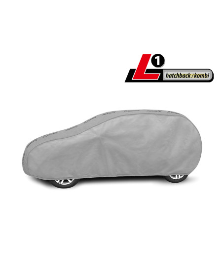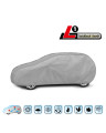 Ganzjährige, wasserdichte Autoschutzabdeckung BASIC GARAGE, die die sich unter der Abdeckung ansammelnde Feuchte nach außen leitet. Sie ist für den ganzjährigen Schutz eines geparkten Wagens vor ungünstigen Witterungsbedingungen konzipiert. Dank der Verwendung von zwei Stoffarten bleibt die Abdeckung auch bei intensiven Regenschauern fast komplett dicht und leitet die sich unter der Abdeckung sammelnde Feuchte nach außen ab. Der obere Abdeckungsteil ist aus einem einschichtigen wasserdichten Material gefertigt. Die Seitenflanken sind aus einem schwer dampfdurchlässigen Material gefertigt.