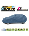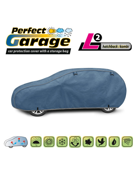 Ganzjährige Membranschutzplane für das Auto mit weichem Innenfutter und witterungsbeständiger Oberfläche. Vollständig aus vierschichtigem Material mit wasserabweisender, dampfdurchlässiger Membran gefertigt. Dadurch ist die Plane komplett wasserdicht, leitet aber den Wasserdampf von innen ab. Ein mit der Perfect Garage abgedeckter PKW bleibt bei Regen trocken, wobei der Wasserdampf durch die Membran verdampft und das Fahrzeug so gegen Korrosion geschützt wird. Darüber hinaus schützt die Stoffgarage gegen Rostflecken, Ausbleichen und Glanzverlust von Lack und Chromteilen. Schützt zudem gegen Regen (auch sauren Regen), Sonne (UV-Strahlung), Staub, Vogelausscheidungen, Blätter, Baumharz, Schnee und Rauhreif. Die weiche Polsterung der Plane verhindert die meisten Kratzer und Lackabschürfungen.