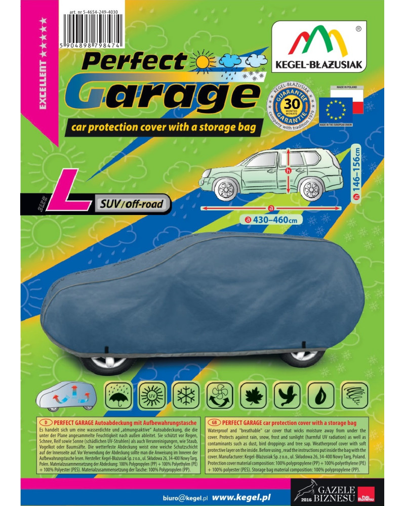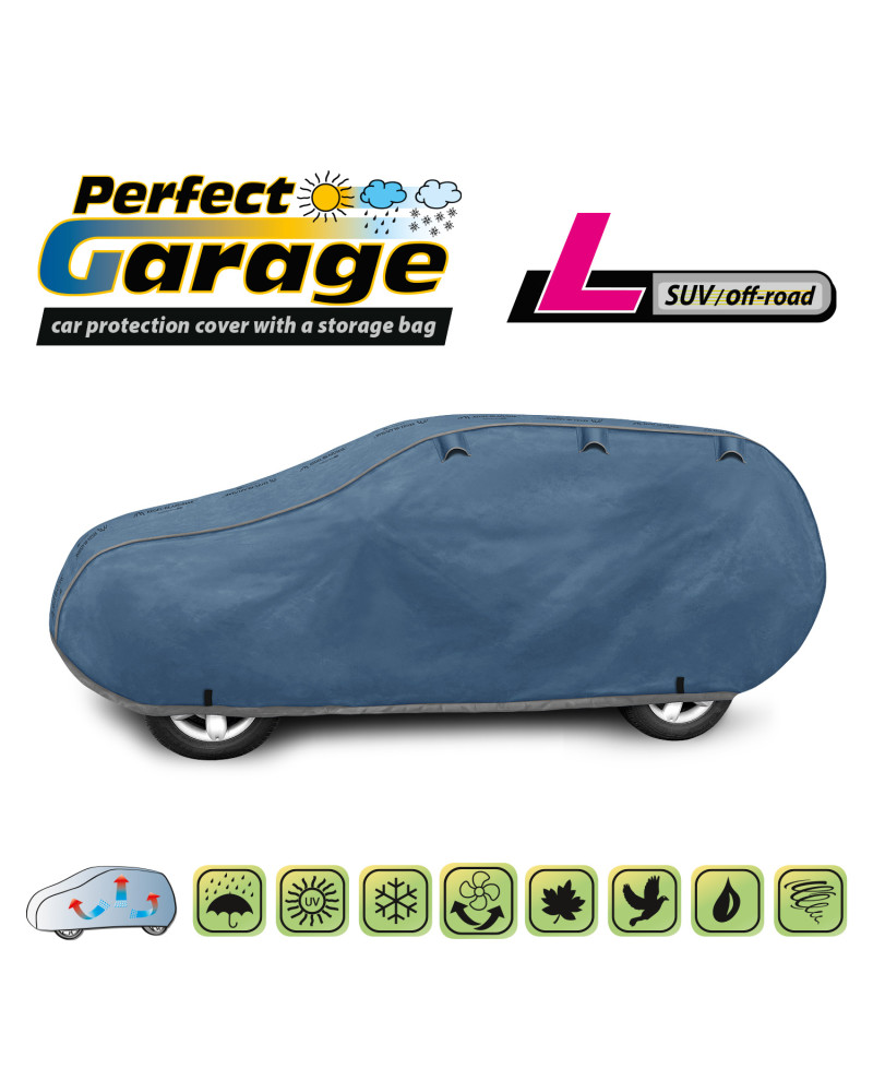 Ganzjährige Membranschutzplane für das Auto mit weichem Innenfutter und witterungsbeständiger Oberfläche. Vollständig aus vierschichtigem Material mit wasserabweisender, dampfdurchlässiger Membran gefertigt. Dadurch ist die Plane komplett wasserdicht, leitet aber den Wasserdampf von innen ab. Ein mit der Perfect Garage abgedeckter PKW bleibt bei Regen trocken, wobei der Wasserdampf durch die Membran verdampft und das Fahrzeug so gegen Korrosion geschützt wird. Darüber hinaus schützt die Stoffgarage gegen Rostflecken, Ausbleichen und Glanzverlust von Lack und Chromteilen. Schützt zudem gegen Regen (auch sauren Regen), Sonne (UV-Strahlung), Staub, Vogelausscheidungen, Blätter, Baumharz, Schnee und Rauhreif. Die weiche Polsterung der Plane verhindert die meisten Kratzer und Lackabschürfungen.
