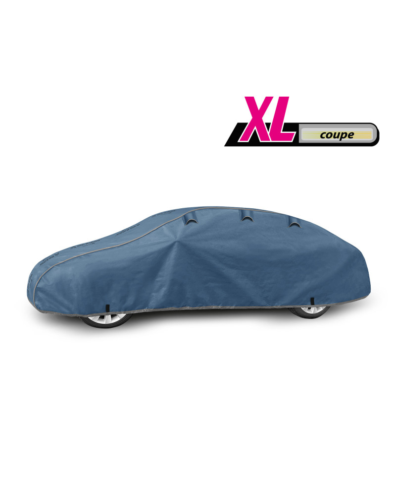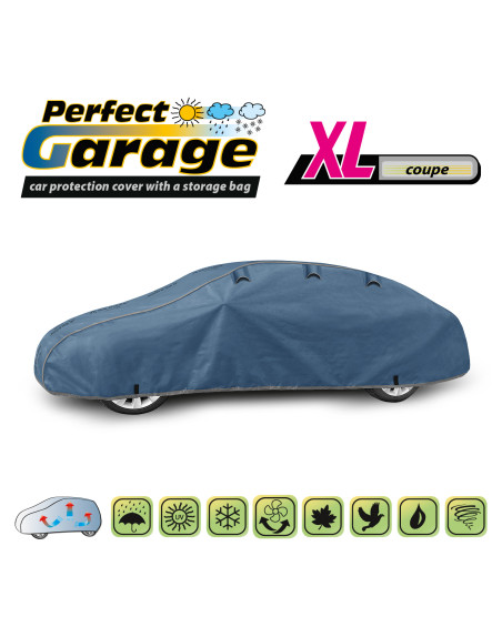 Ganzjährige Membranschutzplane für das Auto mit weichem Innenfutter und witterungsbeständiger Oberfläche. Vollständig aus vierschichtigem Material mit wasserabweisender, dampfdurchlässiger Membran gefertigt. Dadurch ist die Plane komplett wasserdicht, leitet aber den Wasserdampf von innen ab. Ein mit der Perfect Garage abgedeckter PKW bleibt bei Regen trocken, wobei der Wasserdampf durch die Membran verdampft und das Fahrzeug so gegen Korrosion geschützt wird. Darüber hinaus schützt die Stoffgarage gegen Rostflecken, Ausbleichen und Glanzverlust von Lack und Chromteilen. Schützt zudem gegen Regen (auch sauren Regen), Sonne (UV-Strahlung), Staub, Vogelausscheidungen, Blätter, Baumharz, Schnee und Rauhreif. Die weiche Polsterung der Plane verhindert die meisten Kratzer und Lackabschürfungen.
