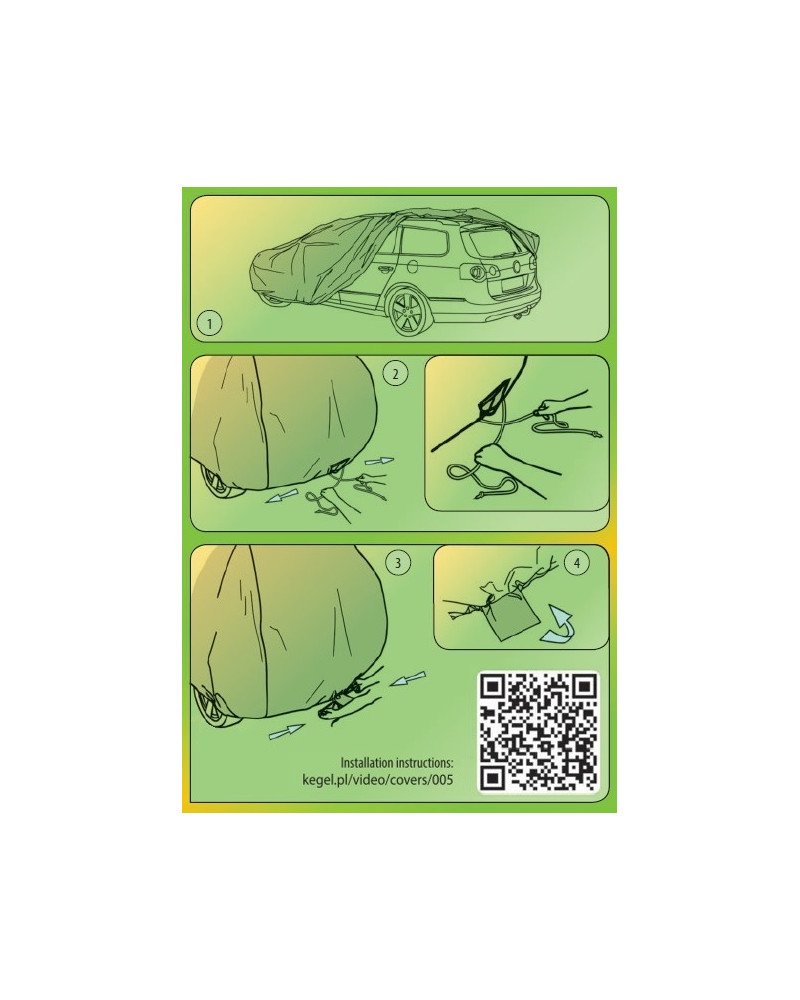 Vor dem Aufziehen der Abdeckung auf den Wagen sind die Spiegel anzuklappen bzw. die Antenne abzuschrauben Die Abdeckung ist auf einen sauberen und trockenen Wagen mit dem Aufdruck nach außen zu ziehen. Um die korrekte Positionierung der Abdeckung auf dem Auto zu erleichtern, sind auf der Vorderseite der Abdeckung das FRONT-Etikett und auf der Rückseite der Abdeckung das REAR-Etikett eingenäht (die Markierungen stimmen mit der Vorder- und Rückseite des Autos überein). Die unteren Abdeckungsabziehleine sind festzuziehen und zu schnüren. Dabei ist darauf zu achten, dass die Abzieherseile vor dem Festziehen gekreuzt werden und so den ersten Knoten bilden. Danach hat man die Seile fest zusammenzuziehen und dabei die Kräfte parallel zur Fahrzeughinterkante zu richten (siehe Abbildung 2 auf dem äußerem Etikett). Die Abzieherseile sind zuzubinden und es ist zu prüfen, ob sich der Knoten nach dem Ziehen des Abziehers nicht löst. Löst sich der Knoten, so ist der Vorgang zu wiederholen und die Bindemethode zu ändern. Fädeln Sie die zusätzlichen Leinen durch die Schlaufen, die am unteren Rand der Abdeckung neben den Fahrzeugrädern eingenäht sind, und befestigen Sie die Abdeckung an den Fahrzeugfelgen (nicht an den Radkappen).