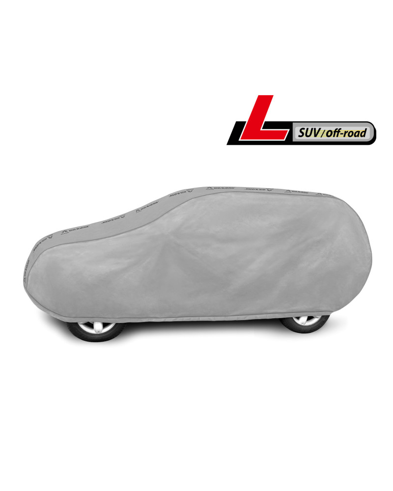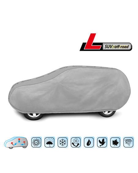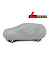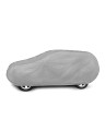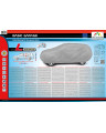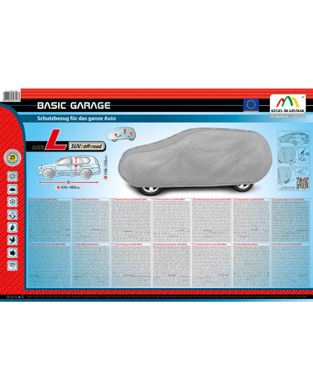 Ganzjährige, wasserdichte Autoschutzabdeckung BASIC GARAGE, die die sich unter der Abdeckung ansammelnde Feuchte nach außen leitet. Sie ist für den ganzjährigen Schutz eines geparkten Wagens vor ungünstigen Witterungsbedingungen konzipiert. Dank der Verwendung von zwei Stoffarten bleibt die Abdeckung auch bei intensiven Regenschauern fast komplett dicht und leitet die sich unter der Abdeckung sammelnde Feuchte nach außen ab. Der obere Abdeckungsteil ist aus einem einschichtigen wasserdichten Material gefertigt. Die Seitenflanken sind aus einem schwer dampfdurchlässigen Material gefertigt.