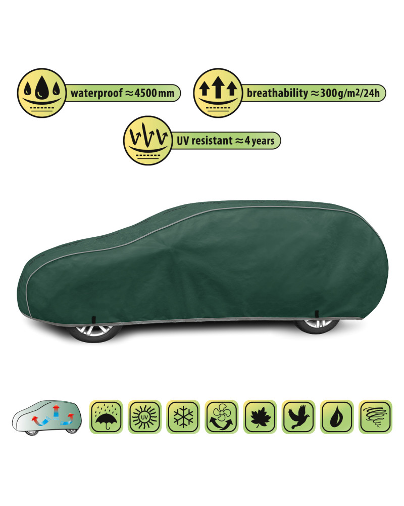 Wasserdichte und gleichzeitig dampfdurchlässige Membranautoabdeckung. Sie ist auch bei starkem Regen wasserdicht und zugleich dampfdurchlässig, so dass die Feuchtigkeit unter der Abdeckung abtransportiert wird. Wetterfeste Abdeckung, die vollständig aus einer hochgradig dampfdurchlässigen Membran besteht. Sie schützt vor Regen, Schnee, Frost und Sonnenlicht (schädlicher UV-Strahlung) sowie Verunreinigungen wie Staub, Vogelkot und Baumsäfte.
