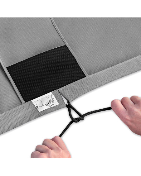 Vor dem Aufziehen der Abdeckung auf den Wagen sind die Spiegel anzuklappen bzw. die Antenne abzuschrauben Die Abdeckung ist auf einen sauberen und trockenen Wagen mit dem Aufdruck nach außen zu ziehen. Um die korrekte Positionierung der Abdeckung auf dem Auto zu erleichtern, sind auf der Vorderseite der Abdeckung das FRONT-Etikett und auf der Rückseite der Abdeckung das REAR-Etikett eingenäht (die Markierungen stimmen mit der Vorder- und Rückseite des Autos überein). Die unteren Abdeckungsabziehleine sind festzuziehen und zu schnüren. Dabei ist darauf zu achten, dass die Abzieherseile vor dem Festziehen gekreuzt werden und so den ersten Knoten bilden. Danach hat man die Seile fest zusammenzuziehen und dabei die Kräfte parallel zur Fahrzeughinterkante zu richten (siehe Abbildung 2 auf dem äußerem Etikett). Die Abzieherseile sind zuzubinden und es ist zu prüfen, ob sich der Knoten nach dem Ziehen des Abziehers nicht löst. Löst sich der Knoten, so ist der Vorgang zu wiederholen und die Bindemethode zu ändern. Fädeln Sie die zusätzlichen Leinen durch die Schlaufen, die am unteren Rand der Abdeckung neben den Fahrzeugrädern eingenäht sind, und befestigen Sie die Abdeckung an den Fahrzeugfelgen (nicht an den Radkappen).