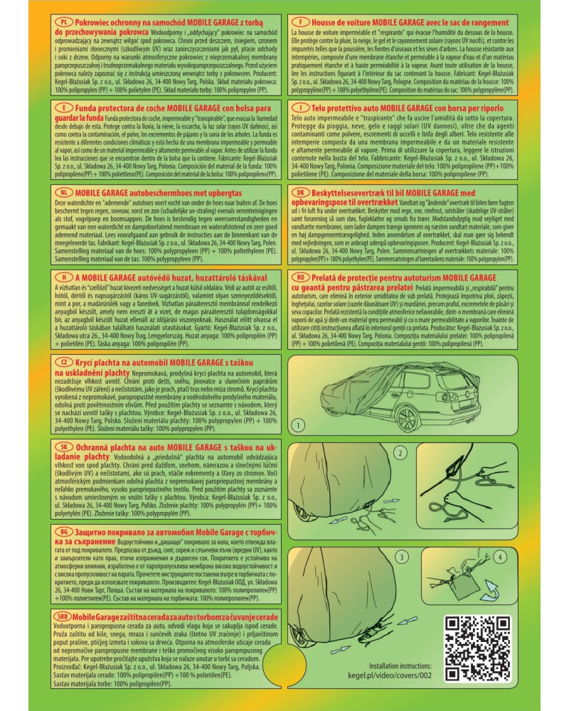 Wasserdichter Schonbezug für das ganze Kraftfahrzeug, der die Feuchtigkeit unter dem Schonbezug abführt. Er schützt das Kraftfahrzeug ganzjährig vor schädlichen Umwelteinflüssen. Der Schonbezug ist für die Fahrzeugmodelle geeignet, die in der oben genannten Tabelle aufgeführt wurden. Er ist leicht aufzubringen und abzunehmen. Dank einer speziellen Struktur und Anfertigung aus dreischichtiger wasserdichter dampfdurchlässiger Membran und schwer wasserdurchlässigem dampfdurchlässigem Material ist der Schonbezug im Regen fast vollständig dicht, und führt zugleich bei positiver Umgebungstemperatur die unter dem Schonbezug angesammelte Feuchtigkeit nach außen ab.