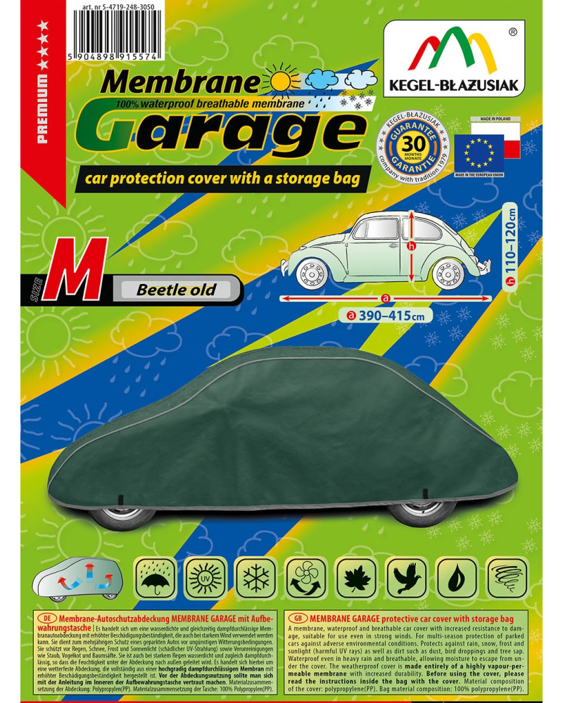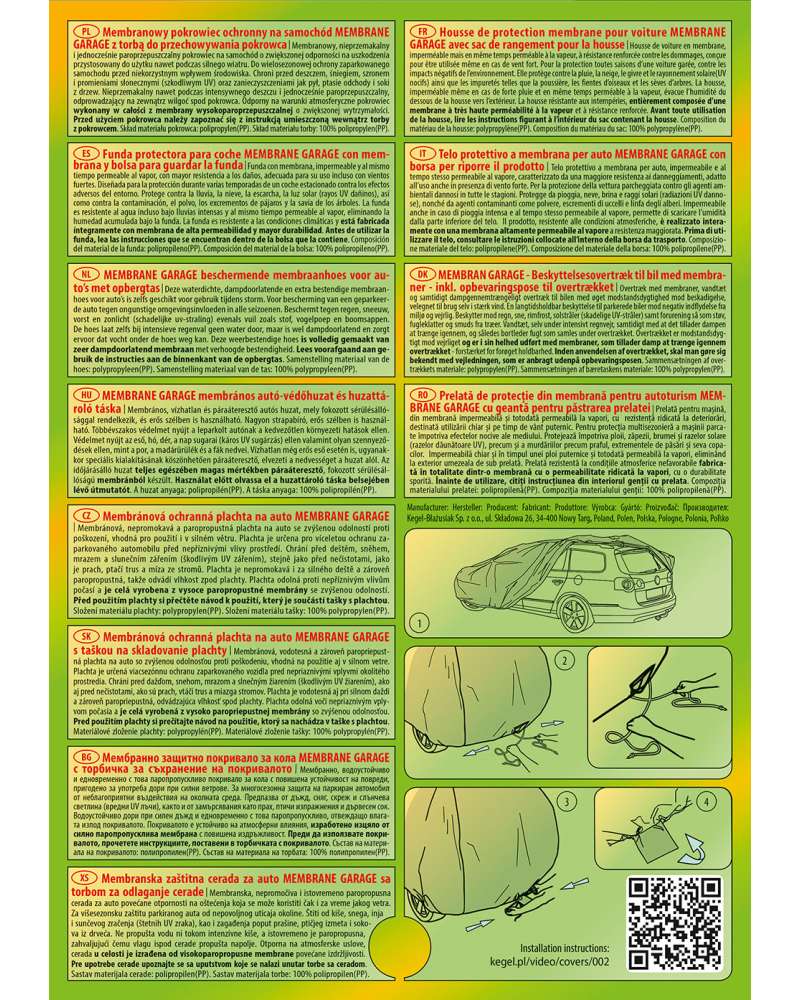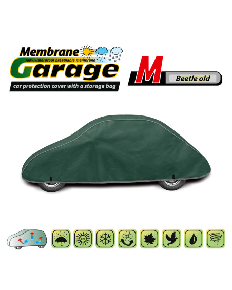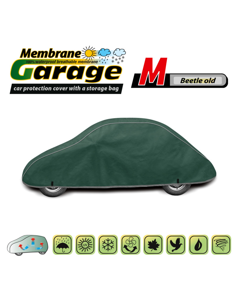 Wasserdichte und gleichzeitig dampfdurchlässige Membranautoabdeckung. Sie ist auch bei starkem Regen wasserdicht und zugleich dampfdurchlässig, so dass die Feuchtigkeit unter der Abdeckung abtransportiert wird. Wetterfeste Abdeckung, die vollständig aus einer hochgradig dampfdurchlässigen Membran besteht. Sie schützt vor Regen, Schnee, Frost und Sonnenlicht (schädlicher UV-Strahlung) sowie Verunreinigungen wie Staub, Vogelkot und Baumsäfte.