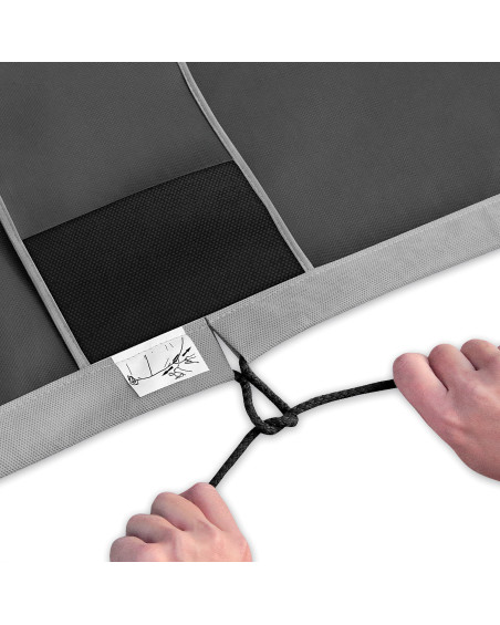 Vor dem Aufziehen der Abdeckung auf den Wagen sind die Spiegel anzuklappen bzw. die Antenne abzuschrauben Die Abdeckung ist auf einen sauberen und trockenen Wagen mit dem Aufdruck nach außen zu ziehen. Um die korrekte Positionierung der Abdeckung auf dem Auto zu erleichtern, sind auf der Vorderseite der Abdeckung das FRONT-Etikett und auf der Rückseite der Abdeckung das REAR-Etikett eingenäht (die Markierungen stimmen mit der Vorder- und Rückseite des Autos überein). Die unteren Abdeckungsabziehleine sind festzuziehen und zu schnüren. Dabei ist darauf zu achten, dass die Abzieherseile vor dem Festziehen gekreuzt werden und so den ersten Knoten bilden. Danach hat man die Seile fest zusammenzuziehen und dabei die Kräfte parallel zur Fahrzeughinterkante zu richten (siehe Abbildung 2 auf dem äußerem Etikett). Die Abzieherseile sind zuzubinden und es ist zu prüfen, ob sich der Knoten nach dem Ziehen des Abziehers nicht löst. Löst sich der Knoten, so ist der Vorgang zu wiederholen und die Bindemethode zu ändern. Fädeln Sie die zusätzlichen Leinen durch die Schlaufen, die am unteren Rand der Abdeckung neben den Fahrzeugrädern eingenäht sind, und befestigen Sie die Abdeckung an den Fahrzeugfelgen (nicht an den Radkappen).