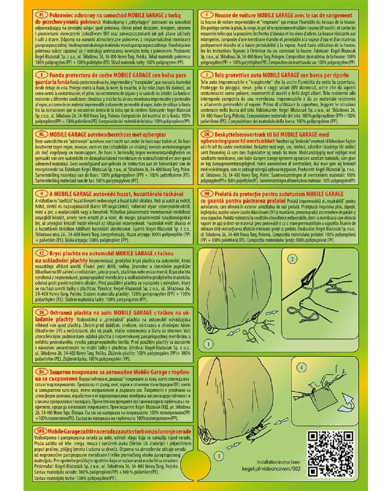 Wasserdichter Schonbezug für das ganze Kraftfahrzeug, der die Feuchtigkeit unter dem Schonbezug abführt. Er schützt das Kraftfahrzeug ganzjährig vor schädlichen Umwelteinflüssen. Der Schonbezug ist für die Fahrzeugmodelle geeignet, die in der oben genannten Tabelle aufgeführt wurden. Er ist leicht aufzubringen und abzunehmen. Dank einer speziellen Struktur und Anfertigung aus dreischichtiger wasserdichter dampfdurchlässiger Membran und schwer wasserdurchlässigem dampfdurchlässigem Material ist der Schonbezug im Regen fast vollständig dicht, und führt zugleich bei positiver Umgebungstemperatur die unter dem Schonbezug angesammelte Feuchtigkeit nach außen ab.