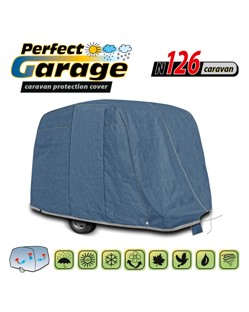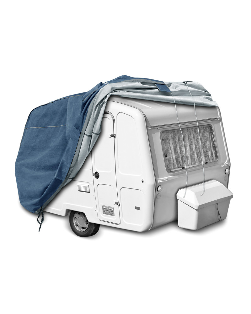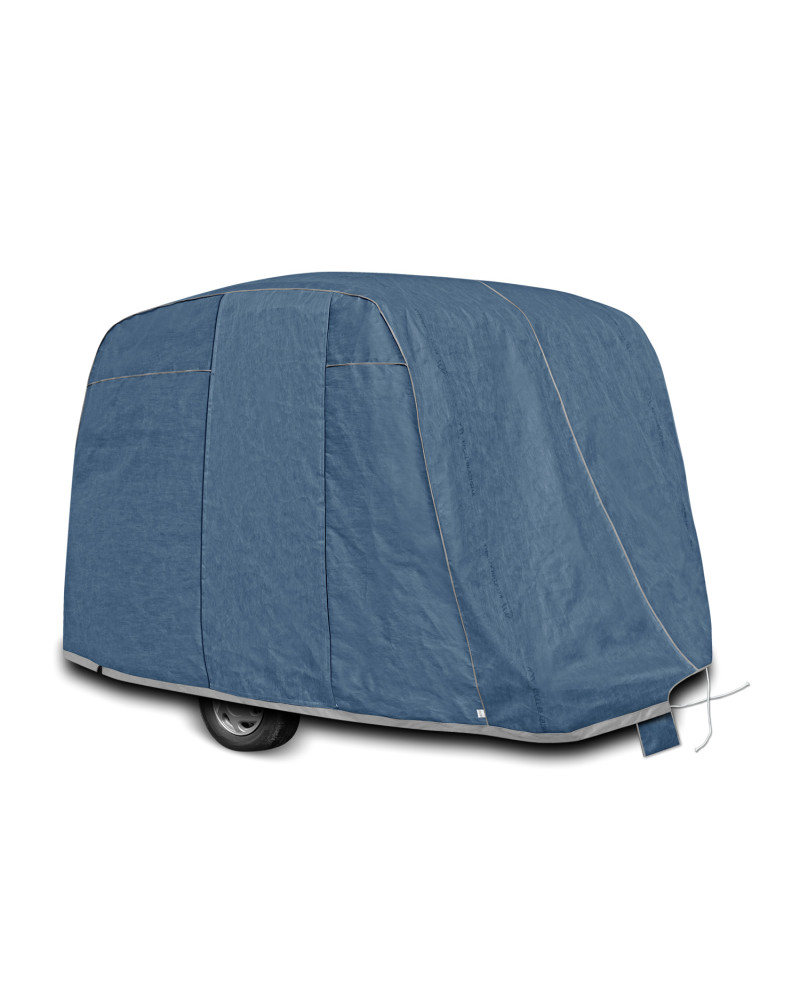 Wasserfeste ganzjährige Schutzhülle für den Wohnwagen, die die Feuchte von der Hüllenunterseite abführt. Sie dient zum ganzjährigen Schutz des geparkten Wohnwagens vor ungünstigen Witterungseinflüssen. Die Hülle ist leicht auf- und abziehbar. Dank einer speziellen Konstruktion und der Ausführung aus einem dreischichtigen dichten dampfdurchlässigen und schwer wasserdurchlässigen Material bleibt die Schutzhülle während eines Regenschauers total dicht und führt bei einer Umgebungstemperatur über den Nullgrad die sich unter der Hülle sammelnde Feuchte nach außen.