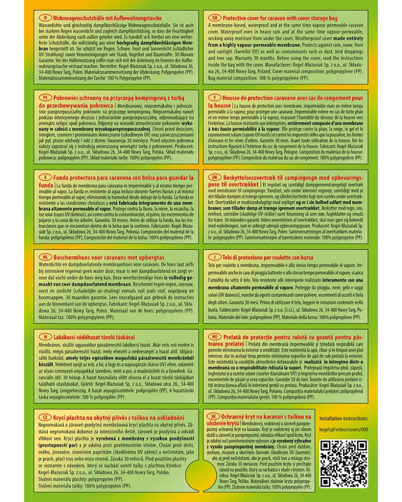Die Hülle ist auf einen sauberen und trockenen Wohnwagen mit der weißen Hüllenseite nach innen (Aufdruck nach außen) aufzuziehen. Um die Hülle ohne Leiter zu montieren, sind zwei Personen mit zwei starken Stangen (Stangen sind nicht im Lieferumfang enthalten) von etwa 1,5 Metern Länge oder mehr erforderlich, je nach Höhe des Wohnwagens. Zunächst sollte man ein großes sauberes Tuch oder Folie hinter dem Wohnwagen auslegen, um die Hülle vor Verschmutzung zu schützen. Auf dieses Tuch oder Folie ist die Hülle abzulegen. Dabei sollte man sie in die gleiche Richtung wie der Wohnwagen legen. Um die korrekte Positionierung zu erleichtern, sind auf der Vorderseite der Hülle das FRONT-Etikett und auf der Rückseite der Hülle das REAR-Etikett eingenäht (die Markierungen stimmen mit der Vorder- und Rückseite des Wohnwagens überein). In den unteren vorderen Ecken der Hülle sind Stangenhalter in Form von Taschen eingenäht, in die die Stangen einzuführen sind. Mit Hilfe der Stangen in den Haltern sollten zwei Personen die Hülle über die Rückseite des Wohnwagens heben und dann die Hülle über das Dach des Wagens ziehen können, indem sie sich entlang der Länge des Wohnwagens vorwärts bewegen (eine Person auf der linken Wagenseite, die andere auf der rechten Wagenseite) und schließlich an der Vorderseite des Wagens enden, so dass die Hülle tatsächlich über den gesamten Wohnwagen gezogen wird. Die unteren Hüllenabziehseile sind festzuziehen und zu schnüren. Dabei ist darauf zu achten, dass die Abzieherseile vor dem Festziehen gekreuzt werden und so den ersten Knoten bilden. Danach hat man die Seile fest zusammenzuziehen und dabei die Kräfte parallel zur Fahrzeugvorderkante zu richten. Die Abzieherseile sind zuzubinden und es ist zu prüfen, ob sich der Knoten nach dem Ziehen des Abziehers nicht löst. Löst sich der Knoten, so ist der Vorgang zu wiederholen und die Bindemethode zu ändern. An der unteren Kante der Hülle sind Zurrgurte eingenäht, die alle unter dem Wohnwagen durch die nächstgelegenen Ösen am Wohnwagenaufbau durchgezogen und danach geschnallt und festgezogen werden müssen.