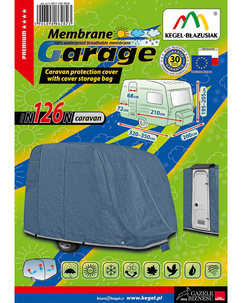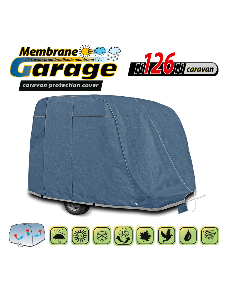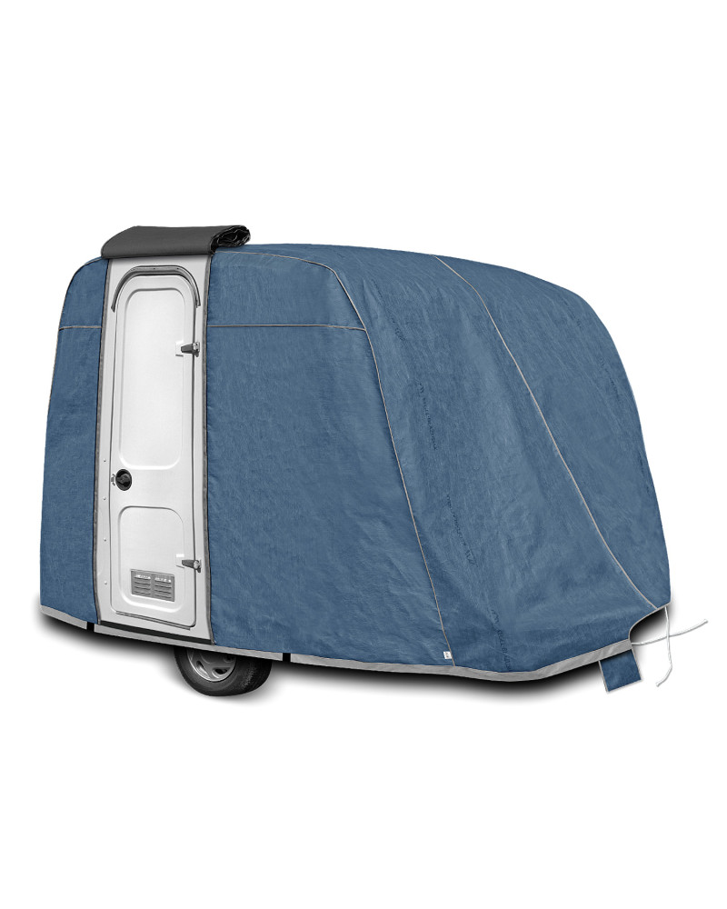 Wasserfeste ganzjährige Schutzhülle für den Wohnwagen, die die Feuchte von der Hüllenunterseite abführt. Sie dient zum ganzjährigen Schutz des geparkten Wohnwagens vor ungünstigen Witterungseinflüssen. Die Hülle ist leicht auf- und abziehbar. Dank einer speziellen Konstruktion und der Ausführung aus einem dreischichtigen dichten dampfdurchlässigen und schwer wasserdurchlässigen Material bleibt die Schutzhülle während eines Regenschauers total dicht und führt bei einer Umgebungstemperatur über den Nullgrad die sich unter der Hülle sammelnde Feuchte nach außen.