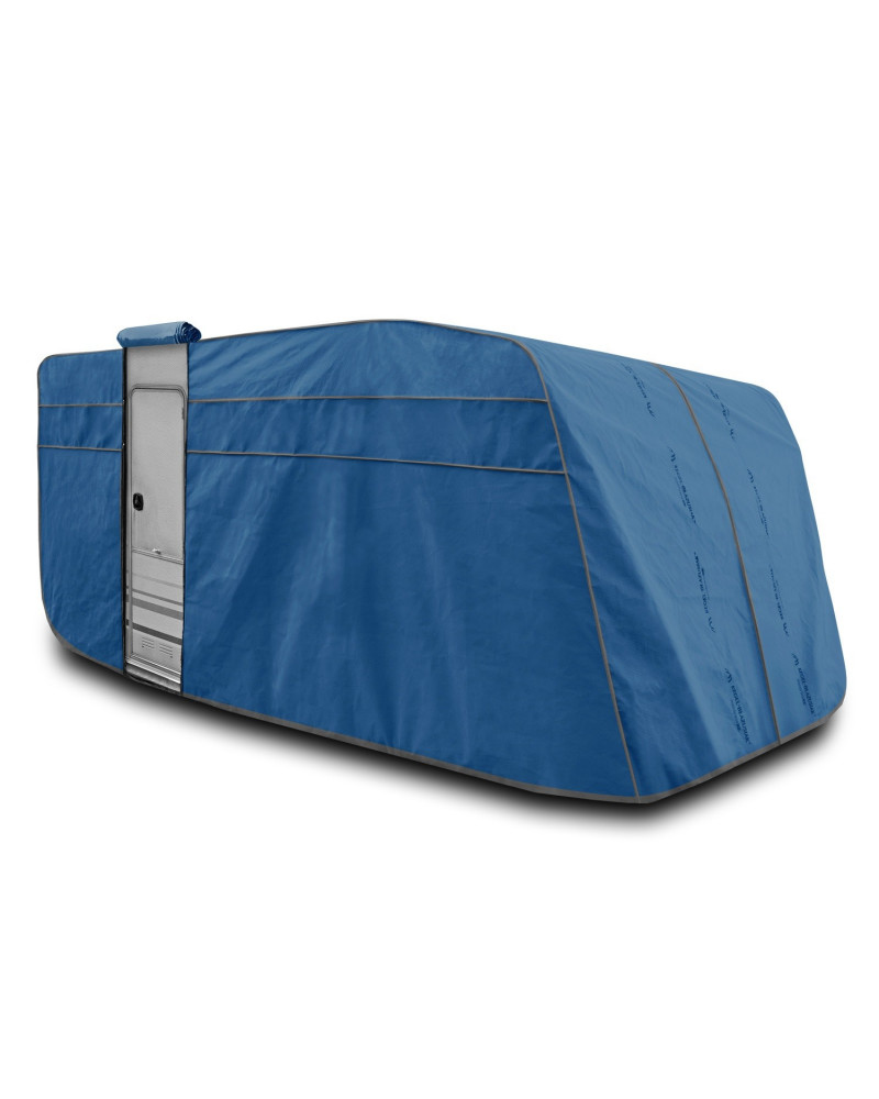 Wasserfeste ganzjährige Schutzhülle für den Wohnwagen, die die Feuchte von der Hüllenunterseite abführt. Sie dient zum ganzjährigen Schutz des geparkten Wohnwagens vor ungünstigen Witterungseinflüssen. Die Hülle ist leicht auf- und abziehbar. Dank einer speziellen Konstruktion und der Ausführung aus einem dreischichtigen dichten dampfdurchlässigen und schwer wasserdurchlässigen Material bleibt die Schutzhülle während eines Regenschauers total dicht und führt bei einer Umgebungstemperatur über den Nullgrad die sich unter der Hülle sammelnde Feuchte nach außen.