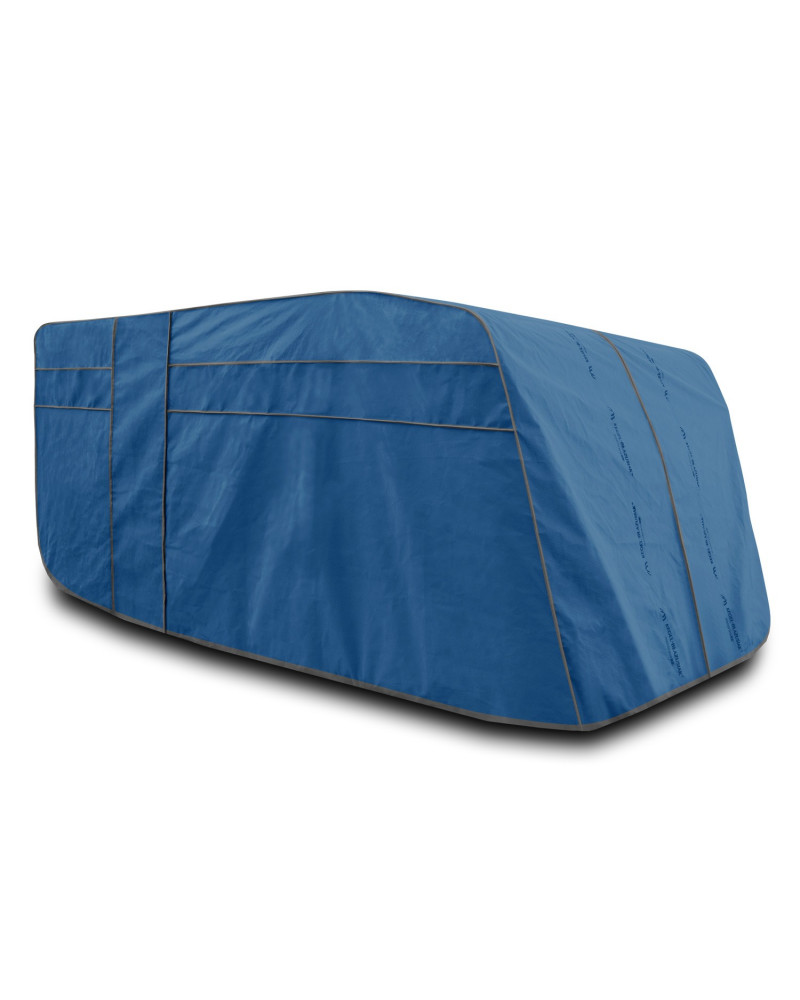 Wasserfeste ganzjährige Schutzhülle für den Wohnwagen, die die Feuchte von der Hüllenunterseite abführt. Sie dient zum ganzjährigen Schutz des geparkten Wohnwagens vor ungünstigen Witterungseinflüssen. Die Hülle ist leicht auf- und abziehbar. Dank einer speziellen Konstruktion und der Ausführung aus einem dreischichtigen dichten dampfdurchlässigen und schwer wasserdurchlässigen Material bleibt die Schutzhülle während eines Regenschauers total dicht und führt bei einer Umgebungstemperatur über den Nullgrad die sich unter der Hülle sammelnde Feuchte nach außen.