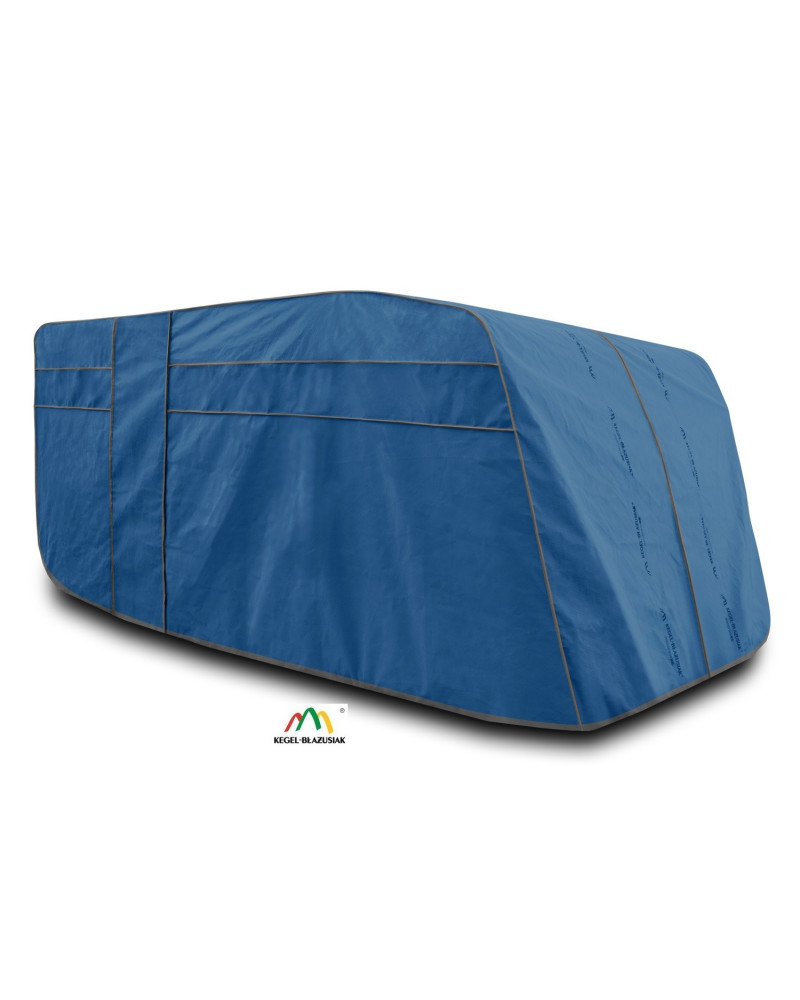 Wasserfeste ganzjährige Schutzhülle für den Wohnwagen, die die Feuchte von der Hüllenunterseite abführt. Sie dient zum ganzjährigen Schutz des geparkten Wohnwagens vor ungünstigen Witterungseinflüssen. Die Hülle ist leicht auf- und abziehbar. Dank einer speziellen Konstruktion und der Ausführung aus einem dreischichtigen dichten dampfdurchlässigen und schwer wasserdurchlässigen Material bleibt die Schutzhülle während eines Regenschauers total dicht und führt bei einer Umgebungstemperatur über den Nullgrad die sich unter der Hülle sammelnde Feuchte nach außen.